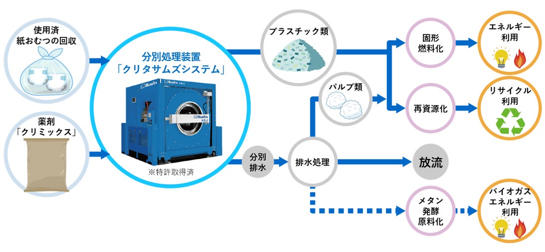 「クリタサムズシステム®」は、クリタが2023年11月から事業展開している、使用済紙おむつを殺菌・洗浄・分解し、ビニール袋などのプラスチック類とパルプ類を含む処理水への分別処理を可能にするもので、使用済紙おむつの焼却処分量や焼却にともなうエネルギー使用量などの削減、CO2排出量の削減への寄与に加え、分別処理後のプラスチック類やパルプ類を再生プラスチックや再生パルプとして再資源化することを支援します。