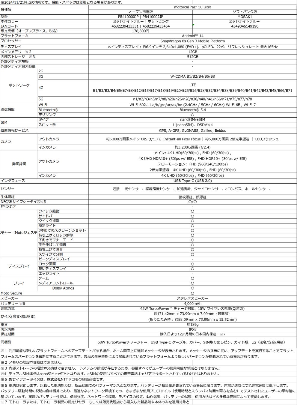 ■motorola razr 50 ultra製品仕様