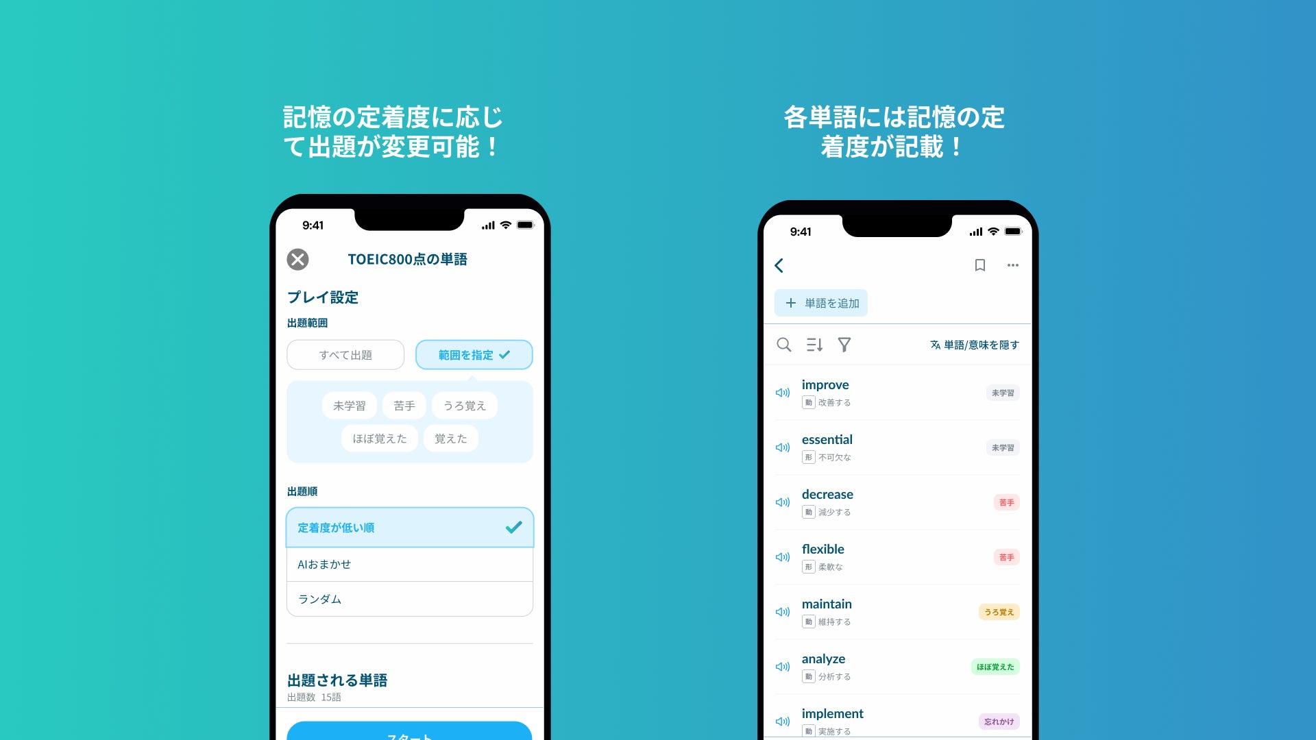 「覚えたい単語だけ集めて復習」「単語ごとの記憶度を“直感的に確認”しながら学習」できる新機能が追加!自分専用の学習リストと記憶の可視化によって自分の習熟度に応じた、より効率的な学習体験を実現します!