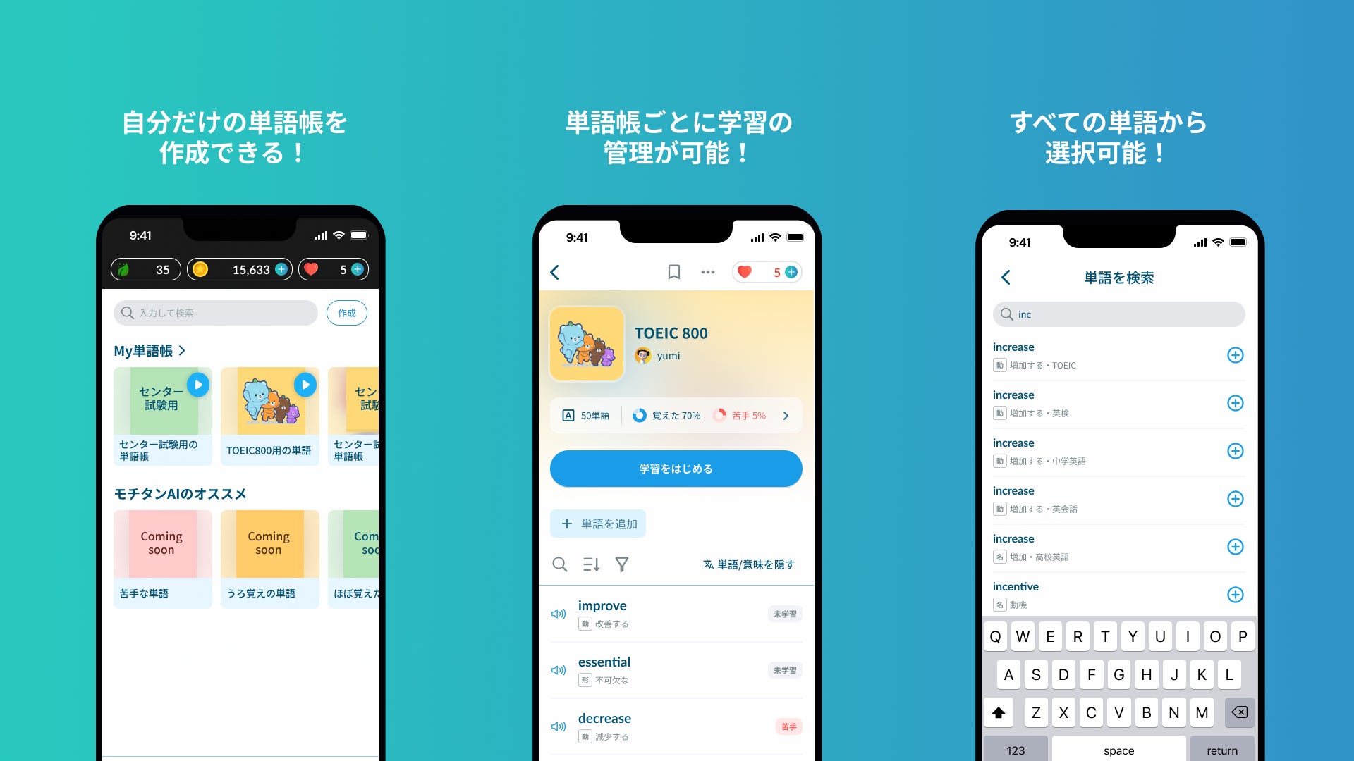 現在はユーザー自身で単語を選んで作成するMy単語帳ですが、次回以降のアップデートでは、AIが記憶状況を分析して、最適な単語を自動でリストアップしてくれる機能も搭載予定です。