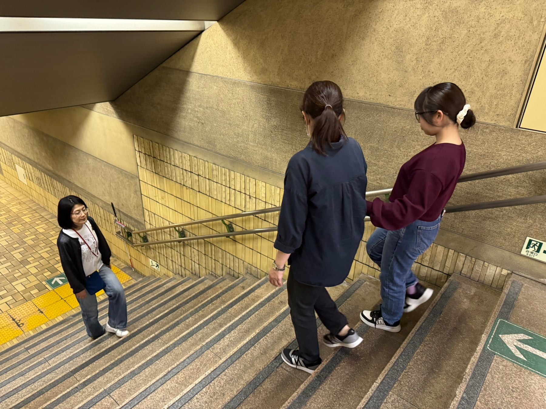平地や着席、階段などの移動介助技術の基本から始まり、駅構内での電車乗り降り、エスカレーターの利用など、応用的な場面でも、盲ろう者が安心して移動できるようにサポートするための技術を体で覚えます。