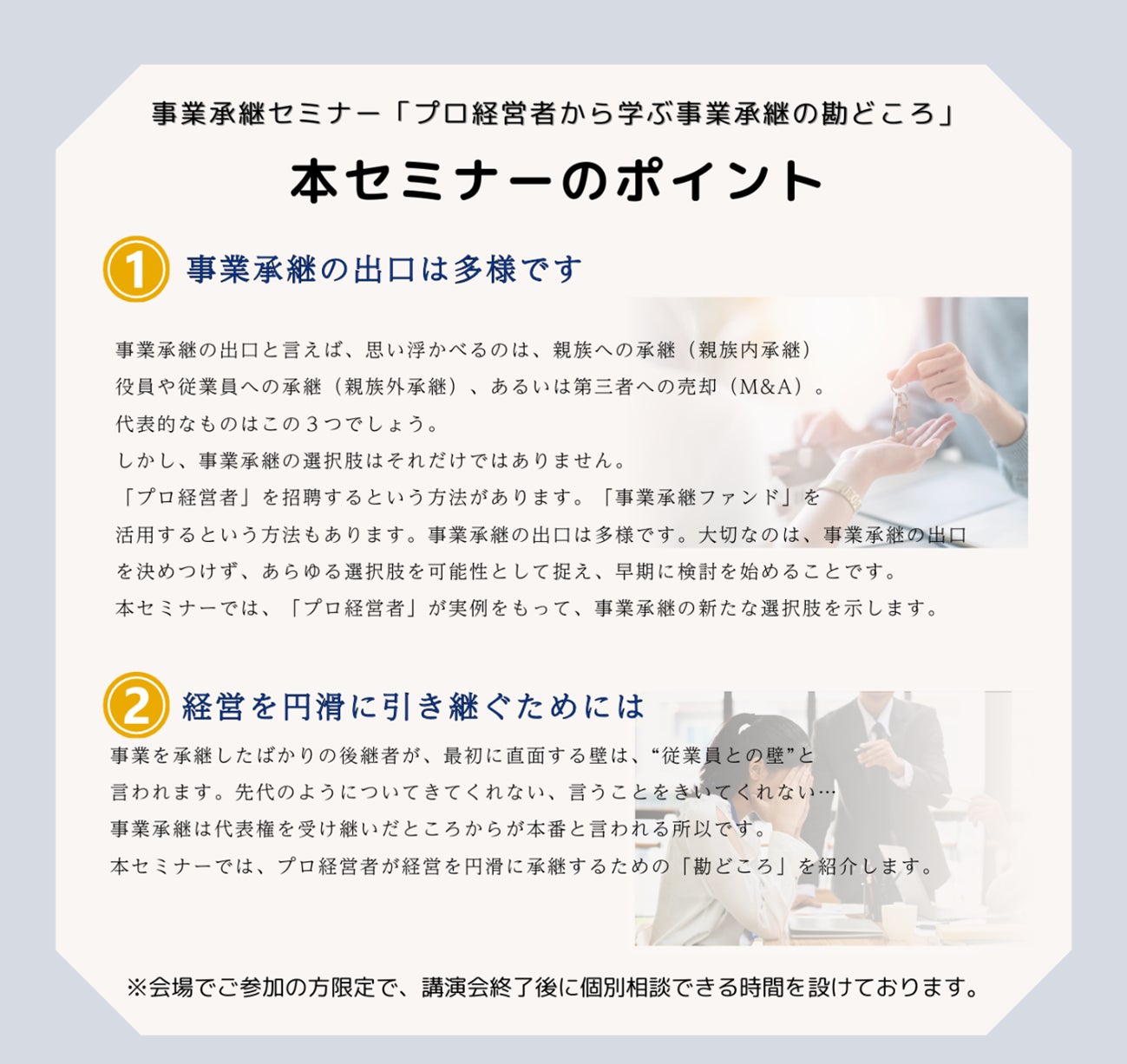 3/5(火)中小企業経営者向け無料セミナー「プロ経営者から学ぶ事業承継の勘どころ」開催