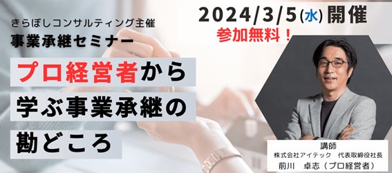 「金融にも強い総合サービス業」を将来像に掲げる東京きらぼしフィナンシャルグループの株式会社きらぼしコンサルティング(本社:東京都港区、代表取締役社長 中野良明)では、事業承継に悩みを持つ中小企業経営者を対象とした無料セミナーをきらぼし銀行本店にて2024年3月5日(火)に開催いたします。