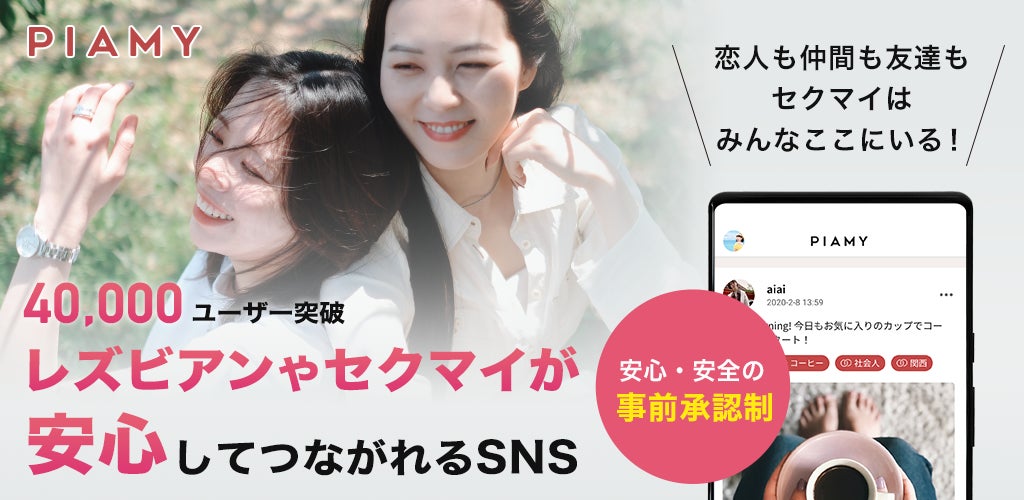 「PIAMY」は、レズビアン、セクシュアルマイノリティの方が安心してつながれる居場所を提供するSNSアプリです。文字や写真を投稿して、共通点でゆるやかに仲を深めることができるため、「その人らしさを知って共感でつながる」ことができます。マイノリティのオンライン空間での安全性を重視することで、ユーザーはサイバーハラスメントやアウティングのリスクを気にせず、のびのびと自己表現ができる仕様になっています。2021年のリリース以来、現在では4万人以上のユーザーに支持されています(2026年2月時点)。
