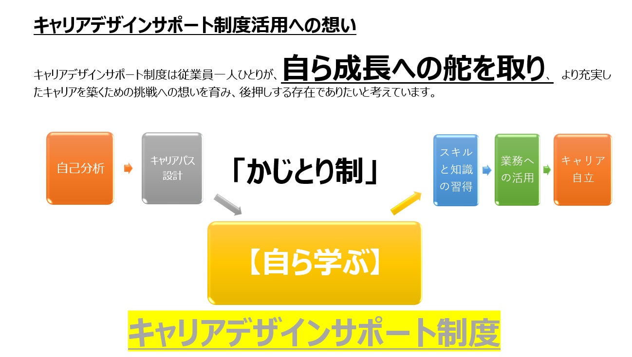 従業員が主体的にキャリアを考え、決定することが、船でいう舵を操作し、船の進路を定めるイメージであることから、本制度において自らの成長へ舵を取る「かじとり制(自己申請)」を採用しています。従業員が自身で学習計画を立て、事前申請することで、学びに必要な支援を受けられます。また、かじとり制には、「全ての従業員が自ら舵をとり、学び、成長する企業風土の醸成」という願いが込められています。