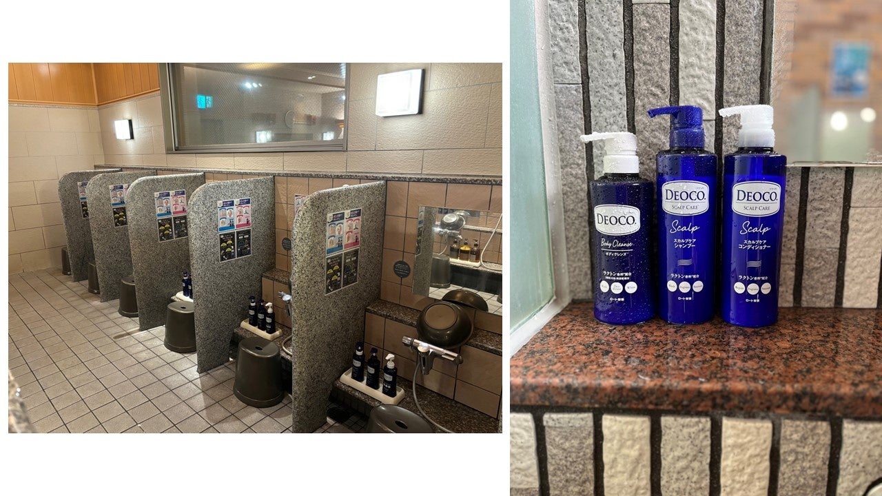 照葉スパリゾート本店の大浴場には9種の内風呂、8種の露天風呂、3種のサウナがあり、洗い場には種類の異なるヘアケア商品を設置しております。今回、洗い場の内10カ所に「デオコ」を設置。