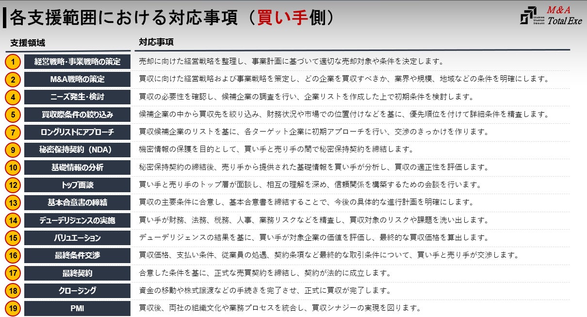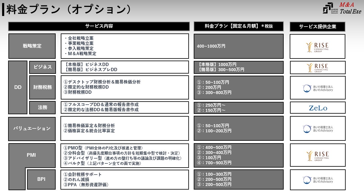 For the provision of this service, the following companies have joined forces to establish a system that offers seamless support across all processes, including the formulation of M&A strategies, optimal matching, contract execution, and even PMI. By collaborating with experienced and highly skilled professional companies, this service ensures the delivery of high-quality support.