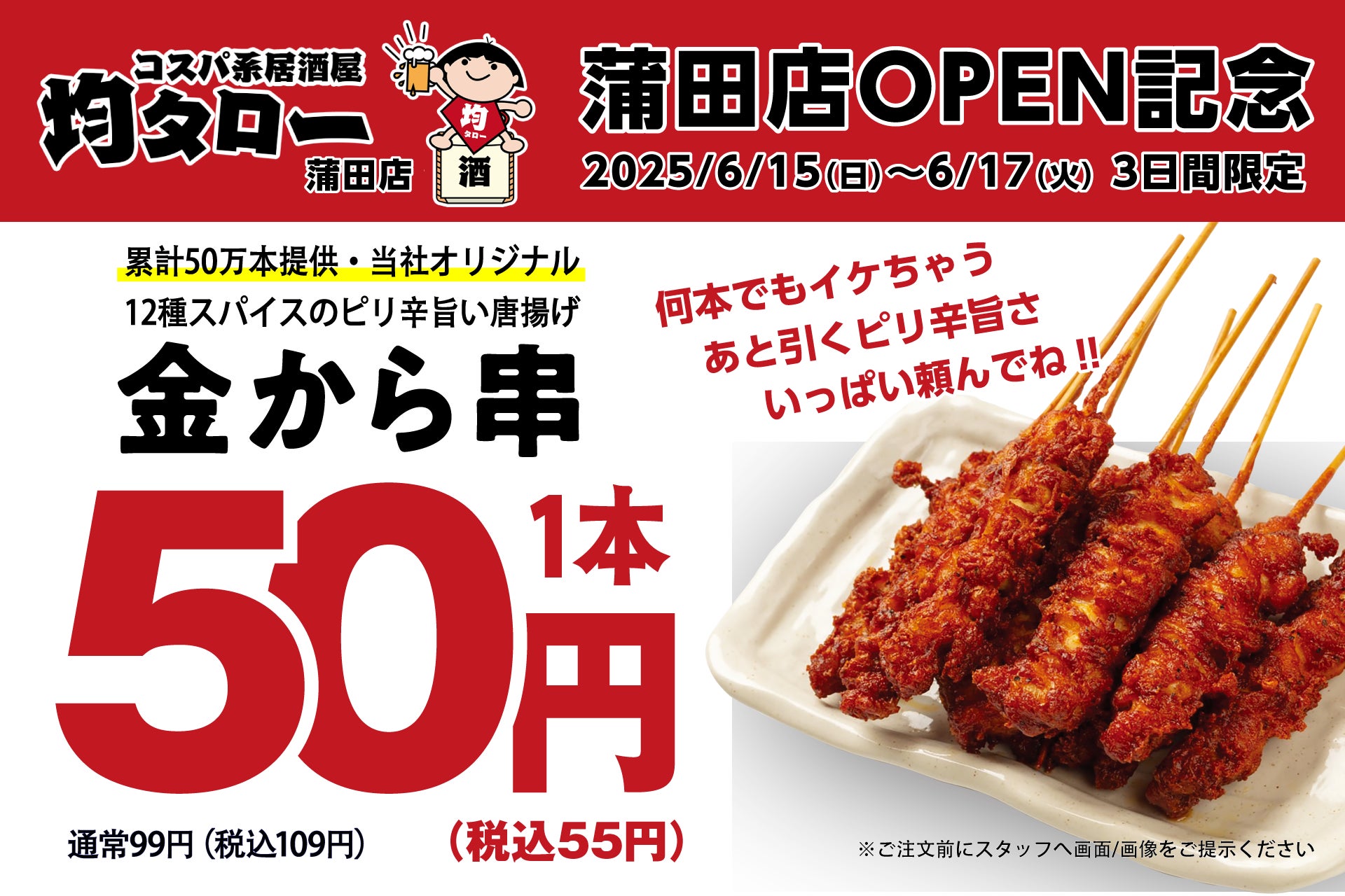 均タロー蒲田店の新規開店を記念しオープニングキャンペーンとして6月15日(日)から3日間について、名物「金から串」を1本50円(税込55円)のお試し価格でご提供します。コスパよく豊富なメニューを楽しめる、いつもの日常がもっと楽しくなる激安コスパ系居酒屋・均タロー 蒲田店へぜひお越しください!