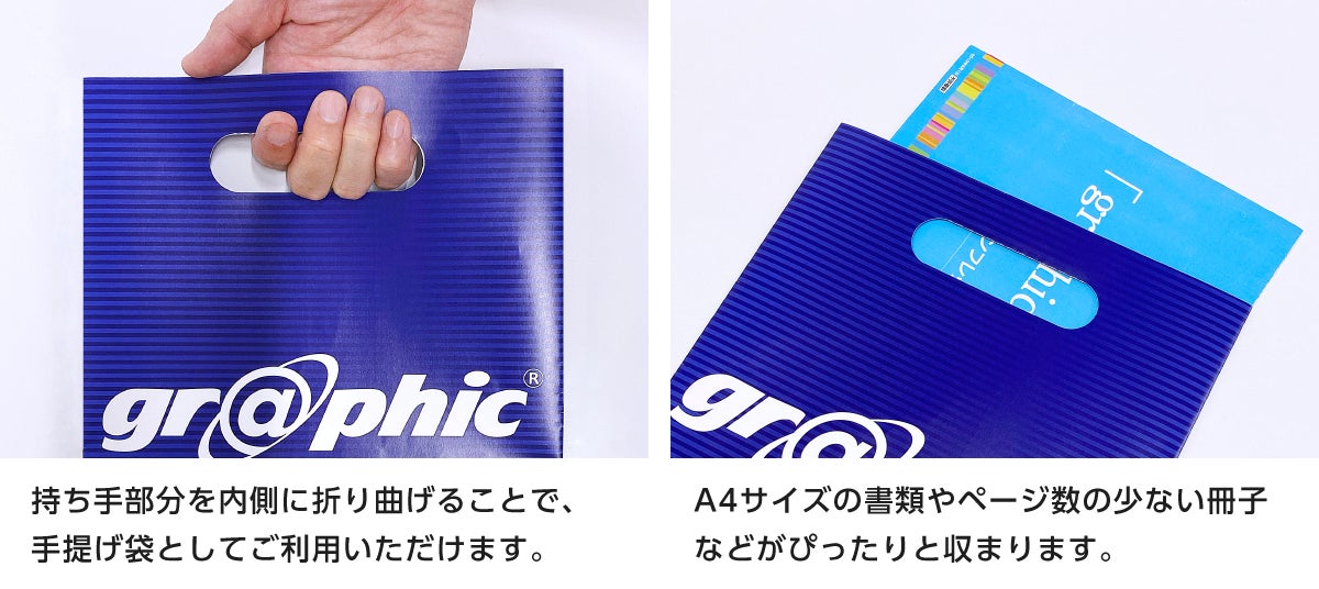 株式会社グラフィック(本社:京都市伏見区、代表取締役社長:西野能央)はネット印刷事業にて、「紙製小判抜き袋」をリリースいたしました。持ち手部分が小判抜き仕様の紙袋で、A4サイズの書類や冊子を収納可能です。全面オリジナルデザイン、フルカラー印刷でご作成いただけます。