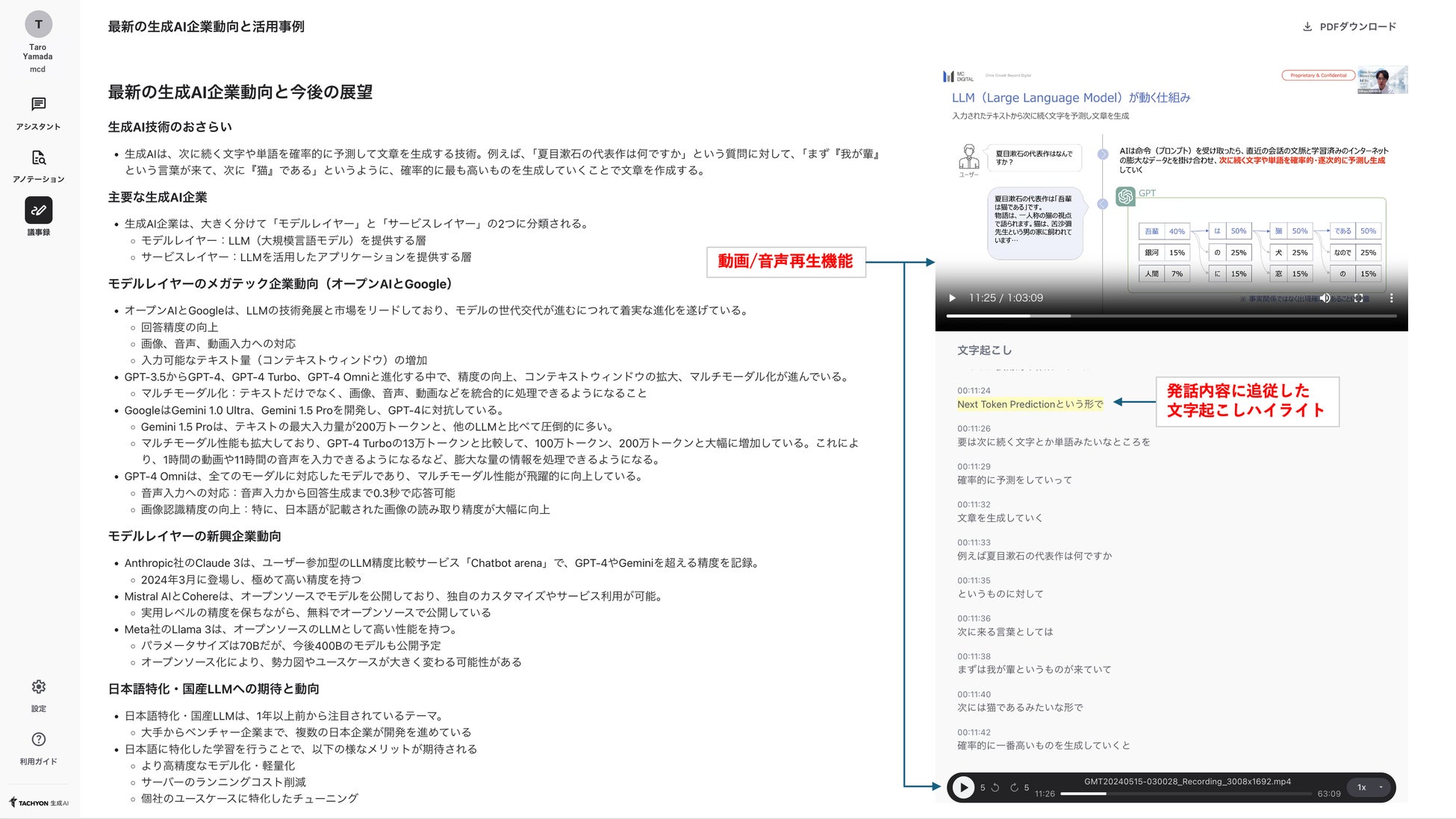アップロードされた動画や音声ファイルが再生可能となり、再生に合わせて自動的に生成された文字起こしがハイライトされます。これにより、会議の内容を正確に確認しながら議事録を作成することが可能となります。