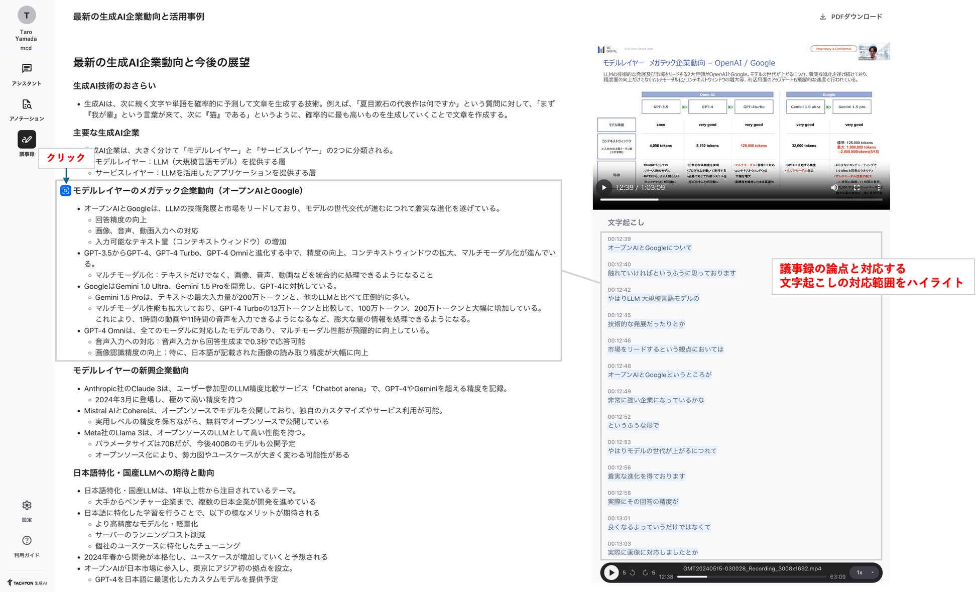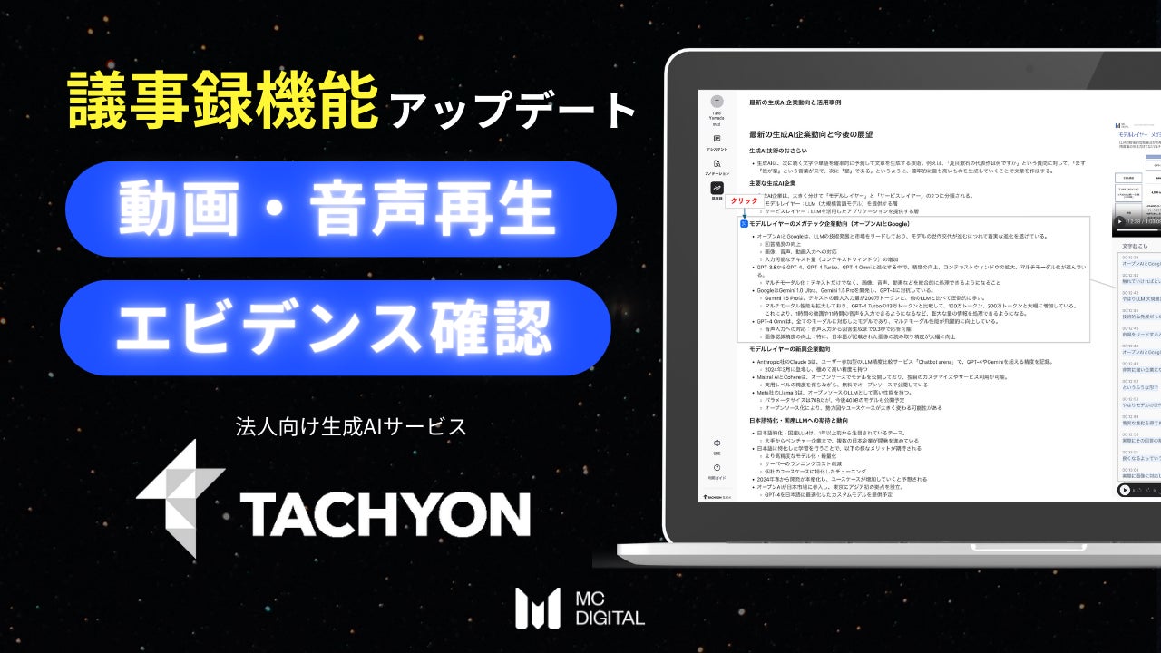 テクノロジーをもって企業の課題解決を支援するエムシーデジタル株式会社(本社:東京都千代田区、代表取締役社長:河内 伸学)は、同社が開発を進めるGPT/Gemini/Claudeの複数LLM利用が可能な法人向け生成AIサービス「Tachyon 生成AI」において、音声・動画データから議事録を自動作成する機能のアップデートを実施しました。今回のアップデートでは、動画・音声再生機能とエビデンス確認機能を新たに追加し、より正確で効率的な議事録作成と校正を可能にしました。