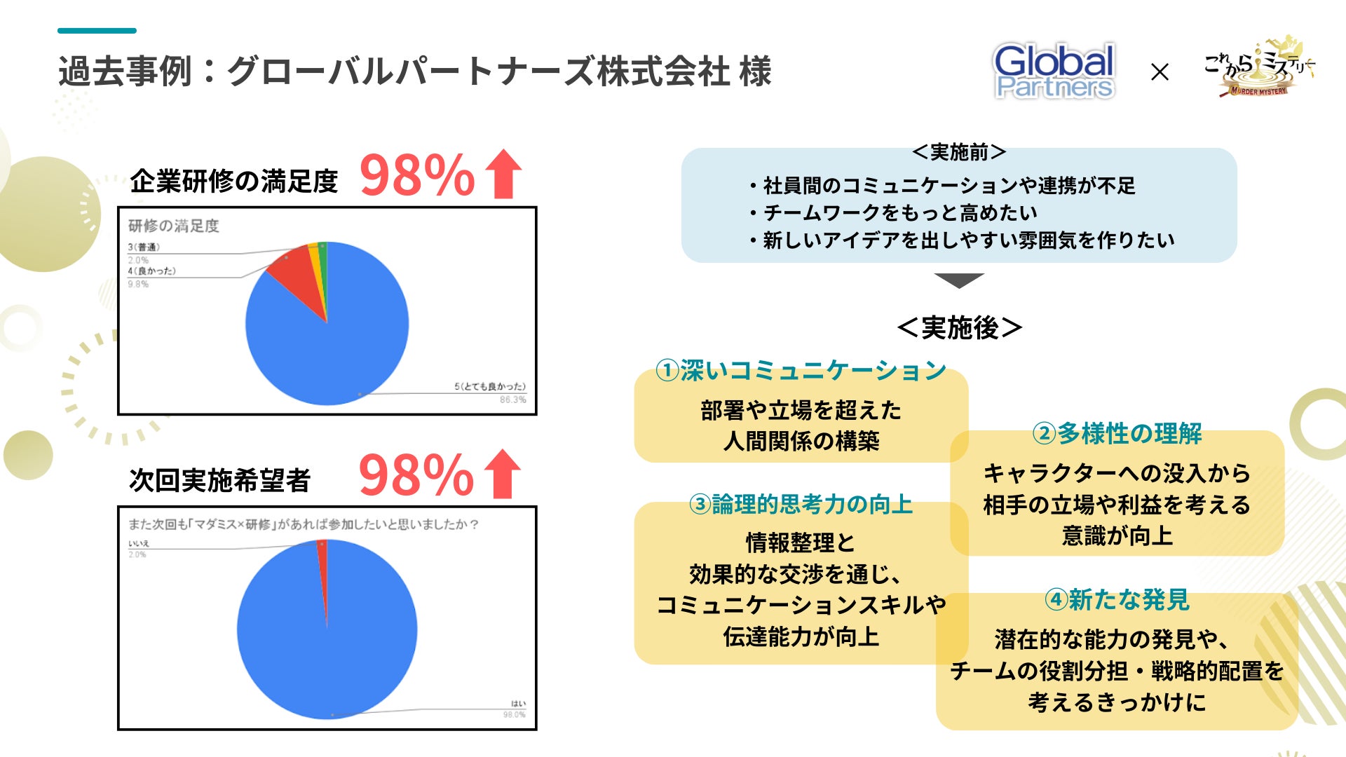 『ミス研』を導入した企業で実施した参加者アンケートでは98%が「またやりたい」と回答。