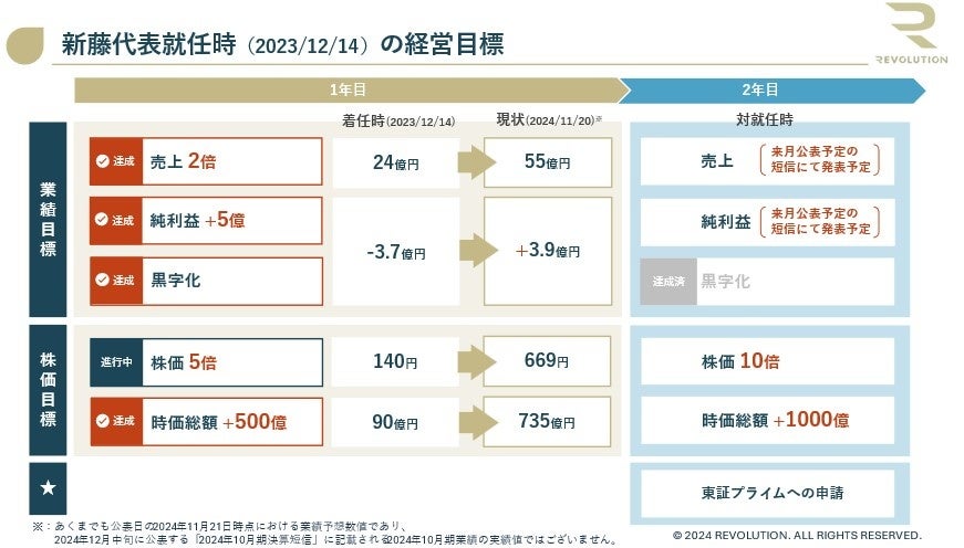 新藤は代表就任以降、業績および株価の目標を1年目・2年目の節目で設定し、目標達成に向け取り組んでまいりました。1年目の目標は順調に達成見込みであり、2年目にはプライム市場への申請を目指し、さらなる企業価値向上に注力いたします。