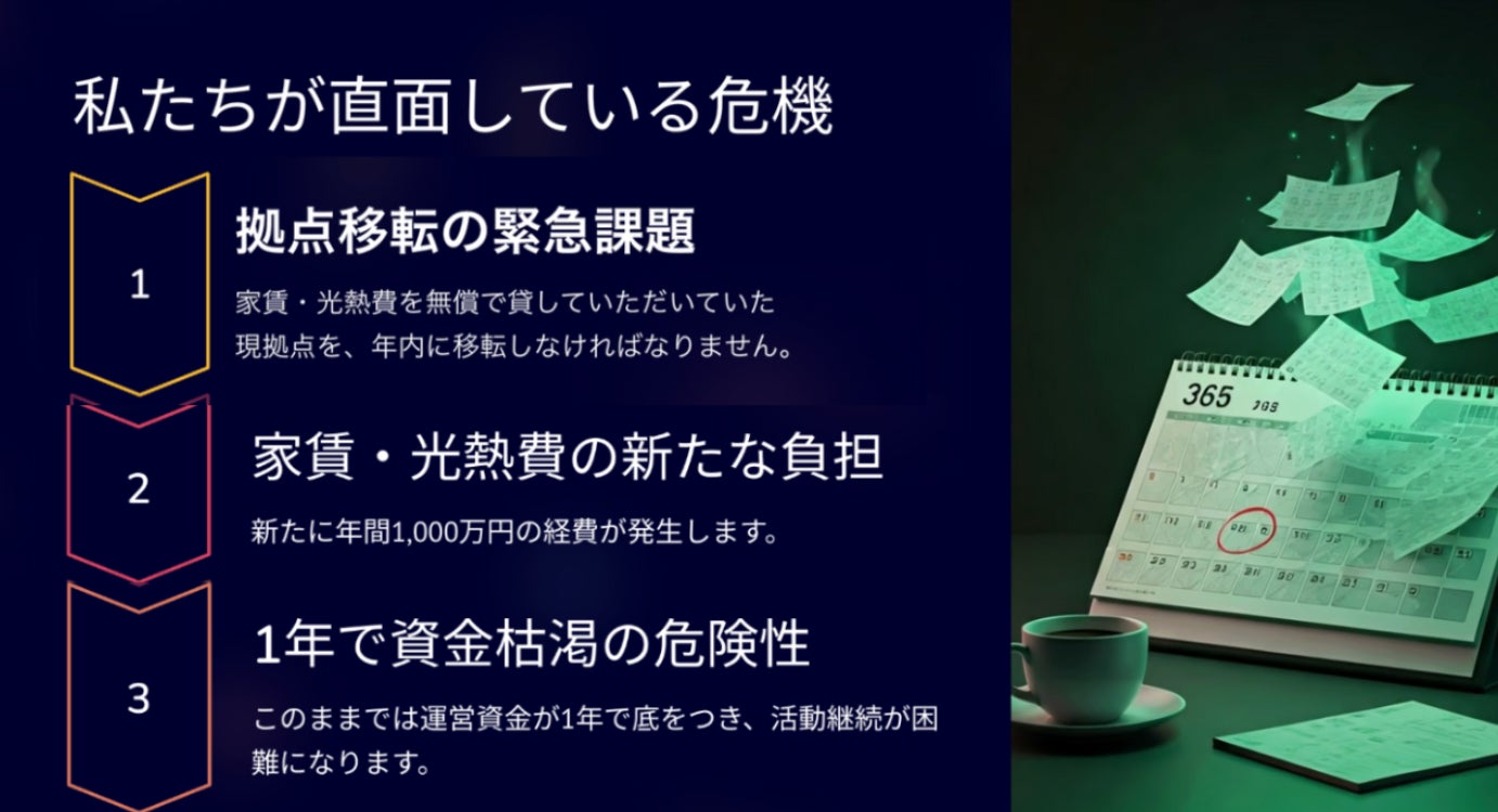 突然降りかかった「運営費の崖」長年にわたり活動を継続できたのは、活動拠点を無償で提供してくださった地域の支援者の方々のおかげでした。しかし、その厚意による提供が終了し、新たに確保した拠点では、月30万円(家賃・光熱費)、年間約360万円の固定経費が発生します。