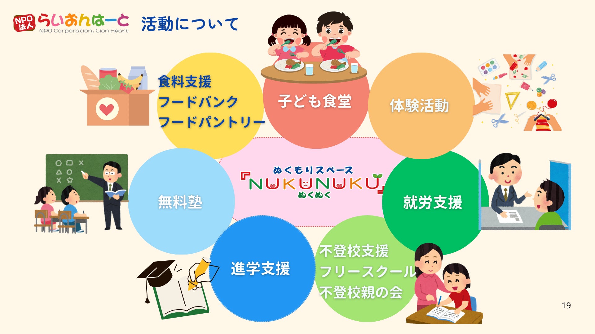 ■事業内容:子ども食堂、体験活動、進学支援、学習支援、フリースクール、フードパントリーなど