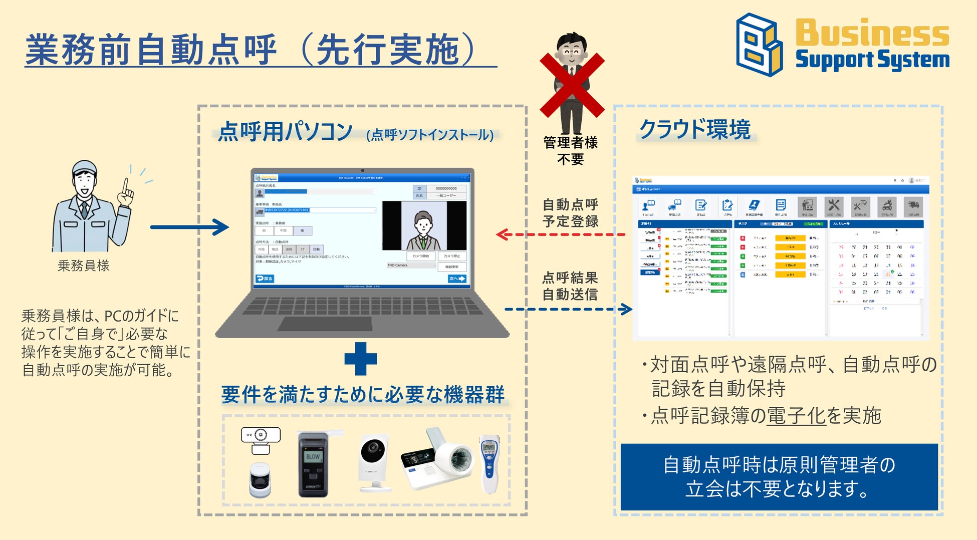 BSS業務前自動点呼(先行実施)では、以下必要機材をご購入頂きシステム運用することで