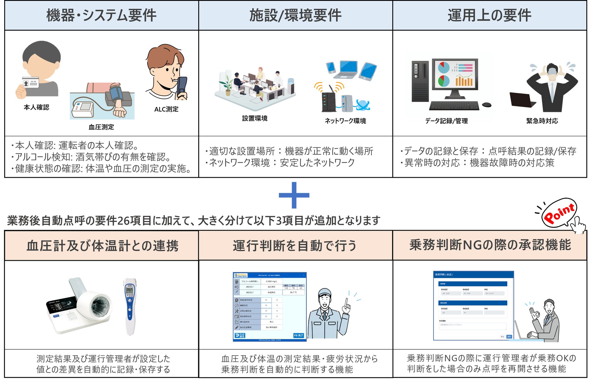 要件:業務後自動点呼の要件(26項目)+以下新規3項目の要件を追加。