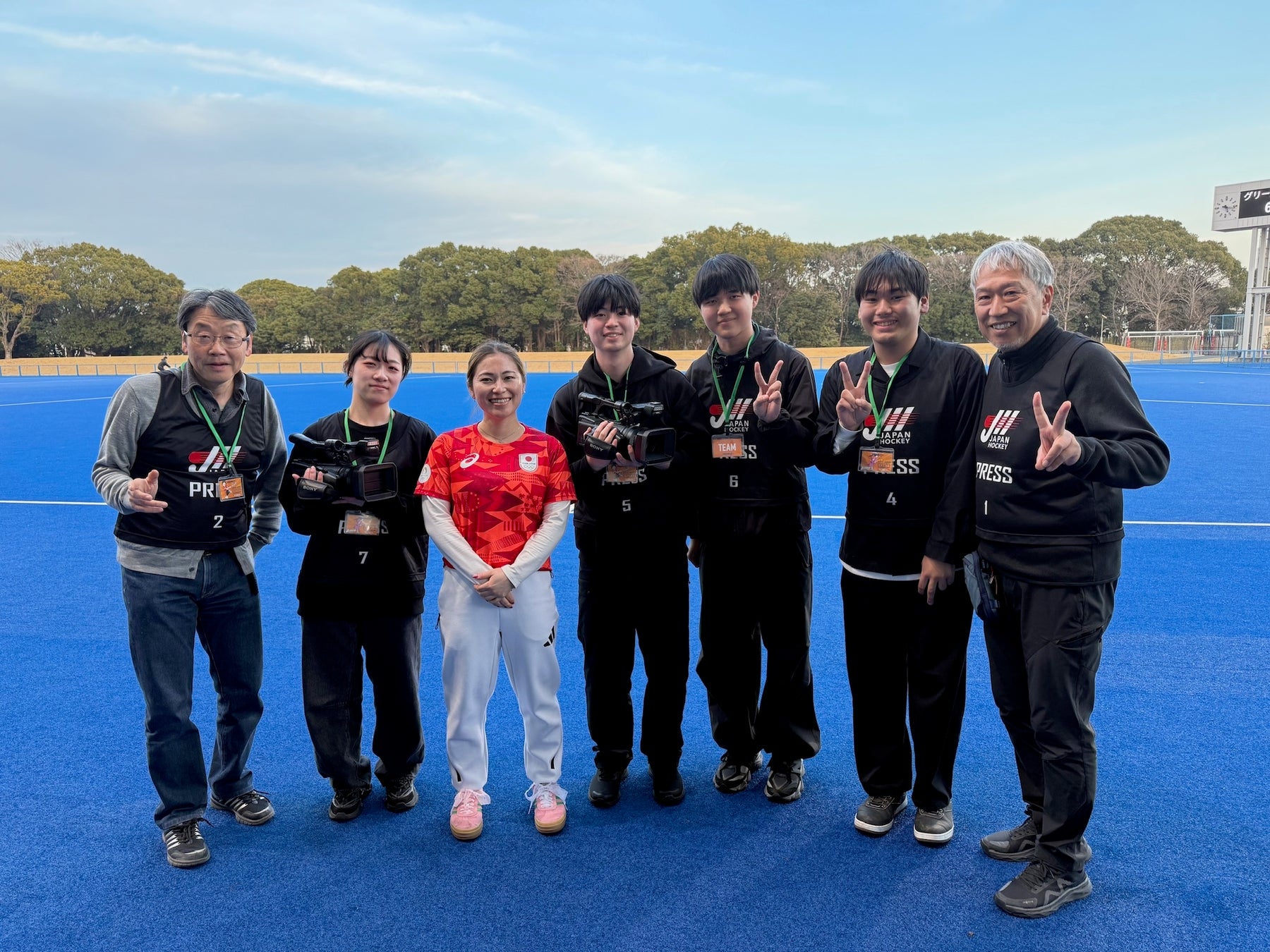 競技としての高い魅力を備えながら、いまだ関心や知名度が十分とはいえないフィールドホッケー。その実情をふまえ、2024年夏には、公益社団法人日本ホッケー協会の協力のもと、女子日本代表チーム「さくらジャパン」の選手たちの魅力や競技としての面白さを広く伝えることを目的に、本学映像メディア学科の学生が中心となって活動を展開。試合映像や密着取材の様子をSNSで発信し、応援の輪を広げる取り組みを行いました。