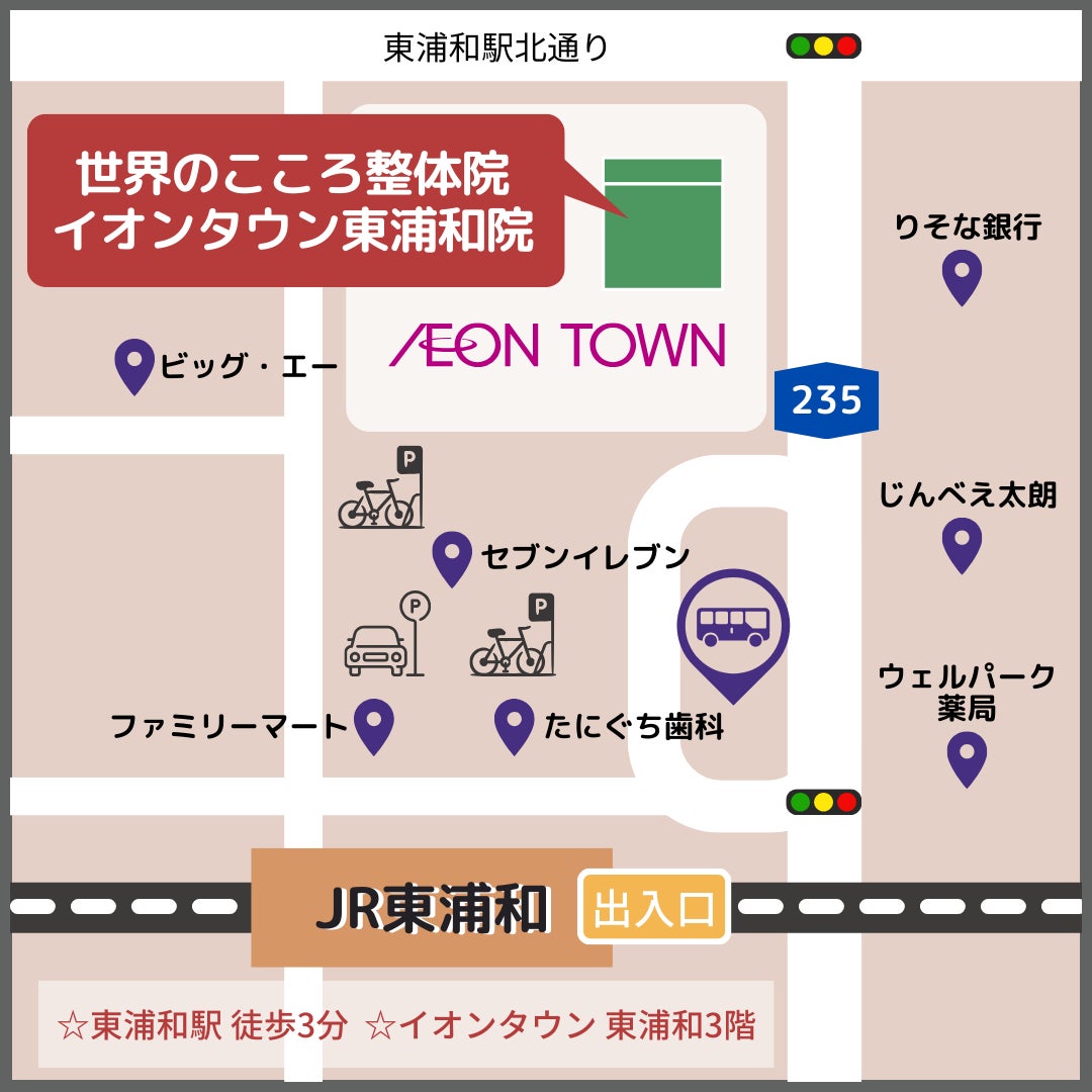 JR東浦和駅北口を出ると目の前にイオンタウン東浦和があり、エスカレーターまたはエレベーターで3階に上がるとすぐに当院です。院内にはバウンサーを完備しており、小さなお子さま連れでも安心して施術を受けていただけます。1階のマルエツでの買い物や、4階のクリニックへの通院と合わせて立ち寄れる利便性も魅力です。