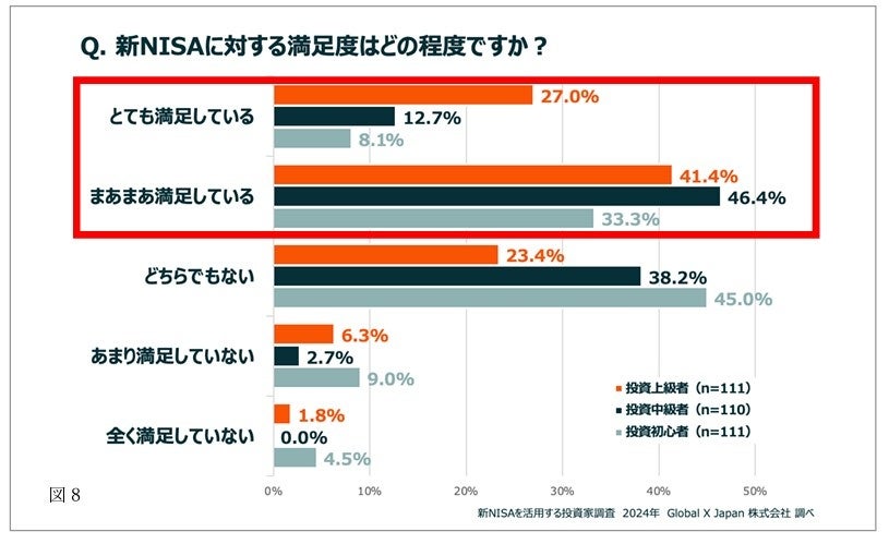 新NISAに対する満足度については、投資上級者の68.4%、中級者の59.1%、初心者の41.4%が「とても満足している」「まぁまぁ満足している」と回答。上級者ほど新NISAに対する満足度が高い結果となりました。(図8)