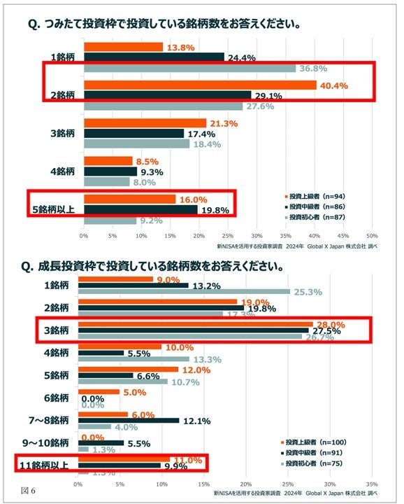 投資中・上級者において、「つみたて投資枠」で約2割の方が5銘柄以上、「成長投資枠」で1割前後の方が11銘柄以上に投資している点が、投資初心者とは異なる特徴となりました。(図6)