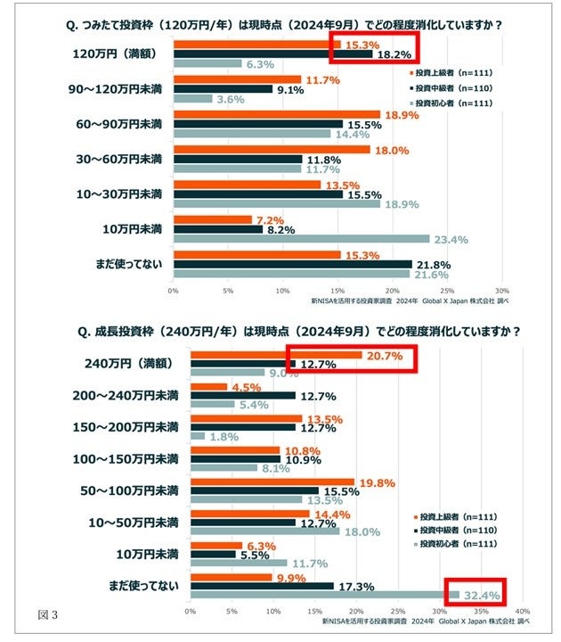 それぞれの投資枠の調査時点(2024年9月)の活用状況については、どちらも投資中・上級者の方が初心者よりも多くの枠を消化しており、既に満額を消化している人も各2割程度みられました。