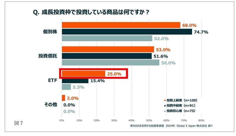 一方「ETF」への投資は、投資初心者では5.3%に留まるものの、投資上級者では25%と、4人に1人が投資をしていることが分かりました。(図7)