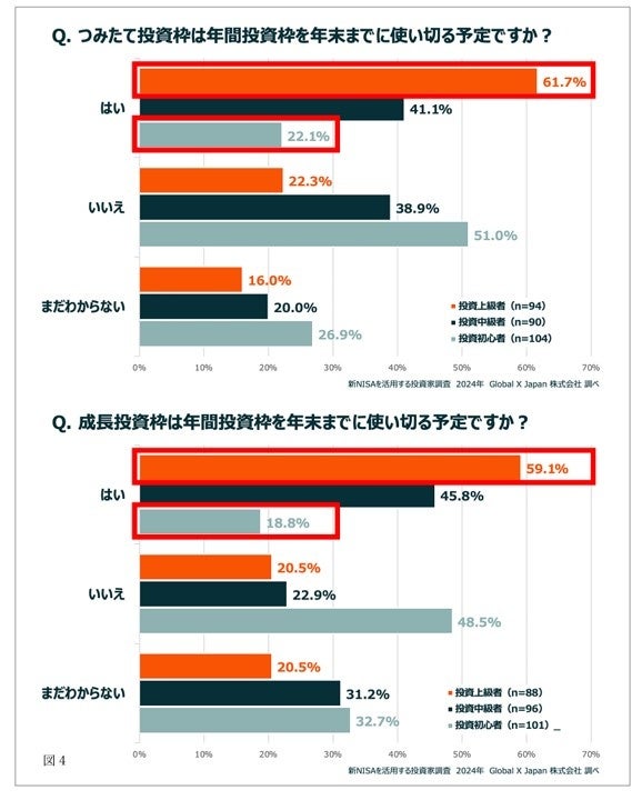 一方、投資初心者においては、投資枠を使い切るとの回答は各 2 割程度に留まりました。(図 4)
