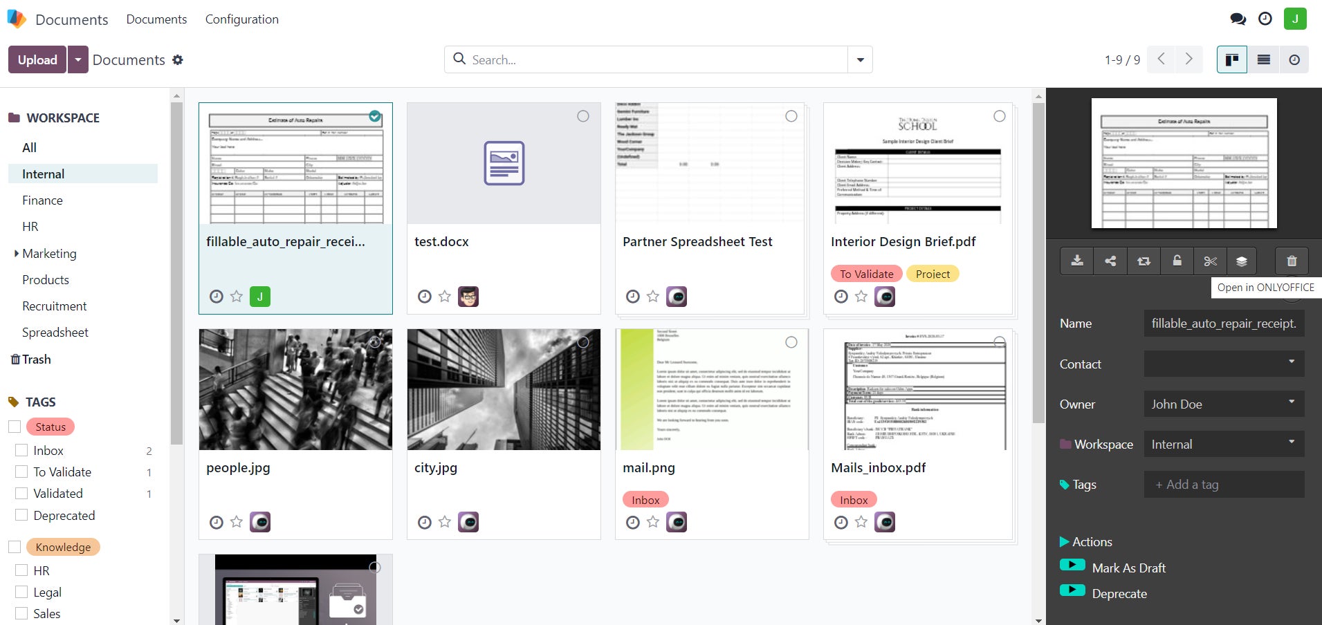 Odooエンタープライズユーザーのために、ONLYOFFICEはDocumentsモデルでオフィスファイルを扱う機能を提供します。上記の機能に加え、新規ドキュメント、シート、スライドの作成が可能です。