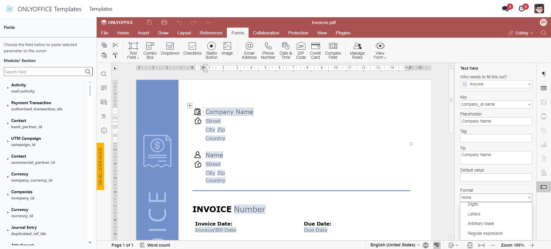 ONLYOFFICEアプリはあらゆるOdooモジュールのフォームテンプレートを作成・編集し、Odooで利用可能なデータをテンプレートに入力し、数回のクリックで印刷することができます。