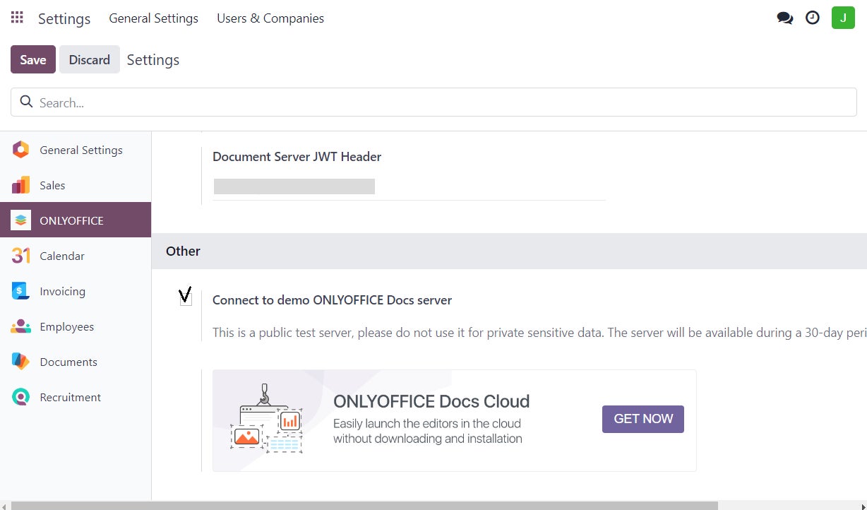 さらに、Odooユーザーはデモサーバーに接続することで、30日間ONLYOFFICE Docsを無料でテストすることができます。このオプションはアプリのインストールのみで、実際のエディタをインストールする必要はありません。