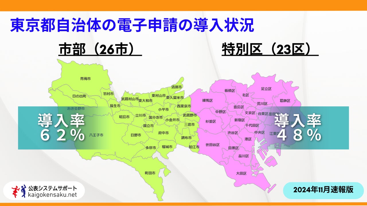 介護業界のDX化を支援する公表システムサポート株式会社(東京都新宿区)では、2024年11月1日に、東京都の特別区(23区)と市部(26市)を対象に、「介護事業所の電子申請」の導入状況を調査しました。