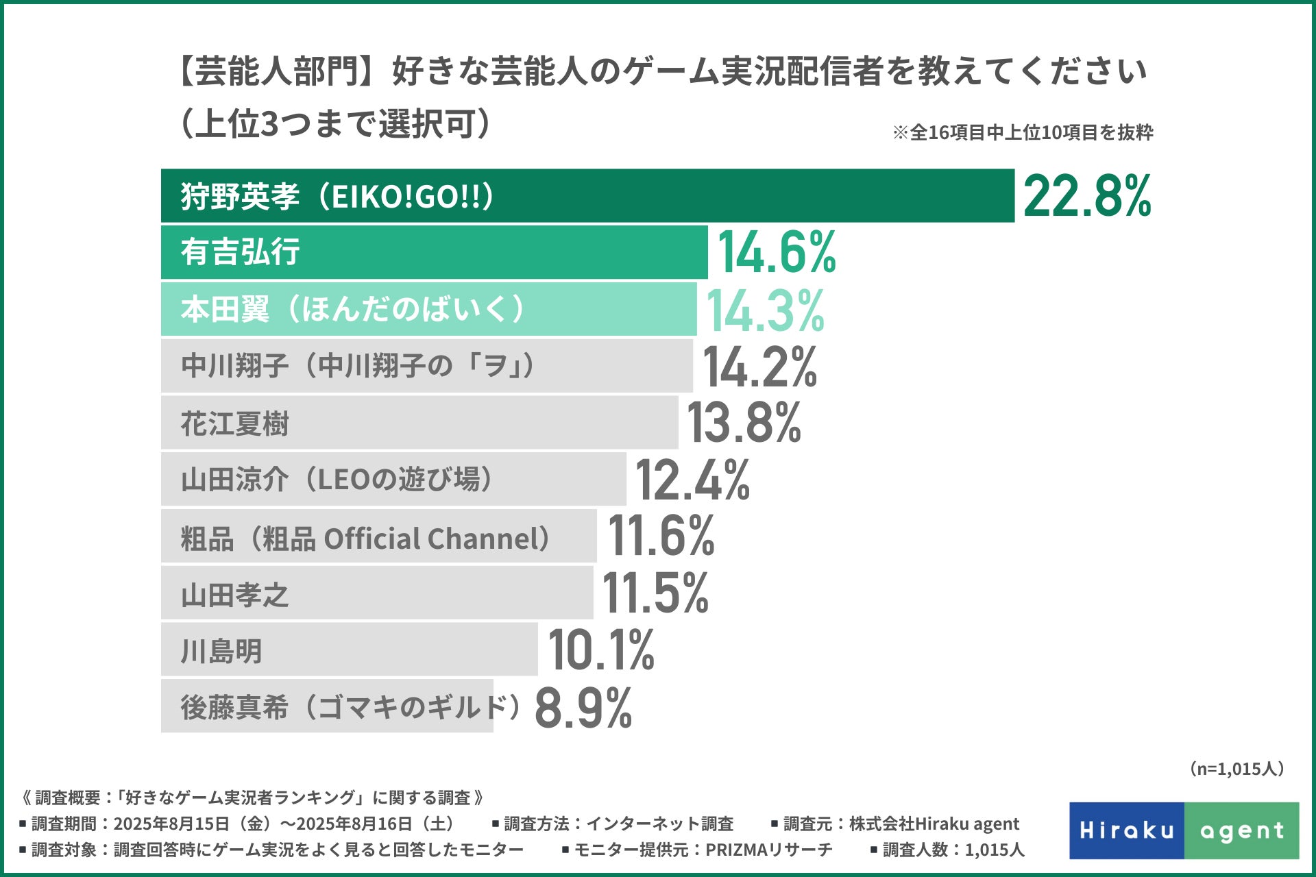 次に、「好きな芸能人のゲーム実況者」について尋ねたところ、『狩野英孝(EIKO!GO!!)(22.8%)』が1位となり、『有吉弘行(14.6%)』『本田翼(ほんだのばいく)(14.3%)』と続きました。