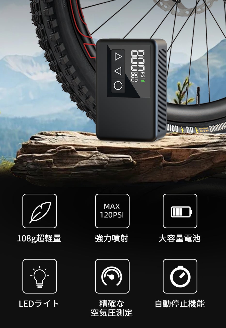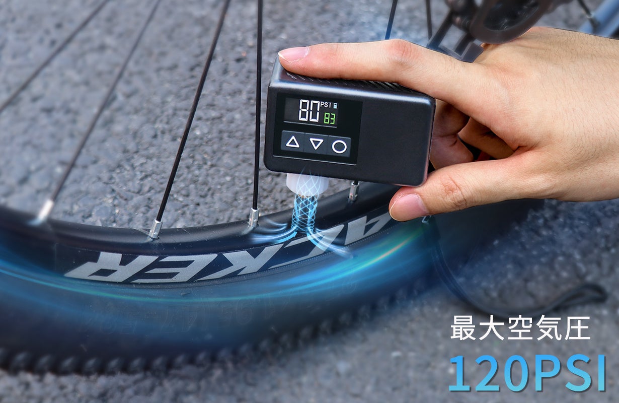 小さい見た目にふさわしくない強力なモーターが搭載されており、最大対応空気圧はなんと120PSI!ボールやマウンテンバイクなどはもちろん、高い空気圧が必要なロードバイクにも手間をかけずに素早く空気入れ可能!