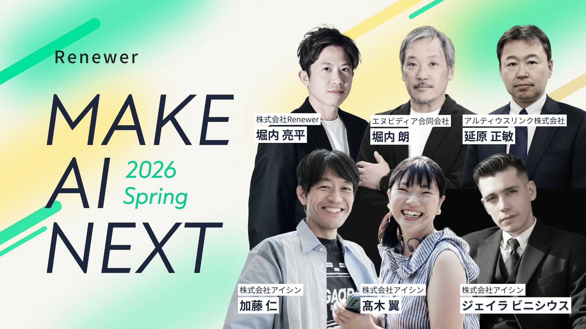 Renewerは2026年4月22日(水)に、無料オンラインカンファレンス「MAKE AI NEXT 2026 Spring」を開催いたします。本カンファレンスは、エンタープライズ企業におけるAI活用の「次の当たり前」を考えるイベントとして、エヌビディア合同会社、アルティウスリンク株式会社、株式会社アイシンの実践者が登壇し、最前線のリアルな事例を共有します。