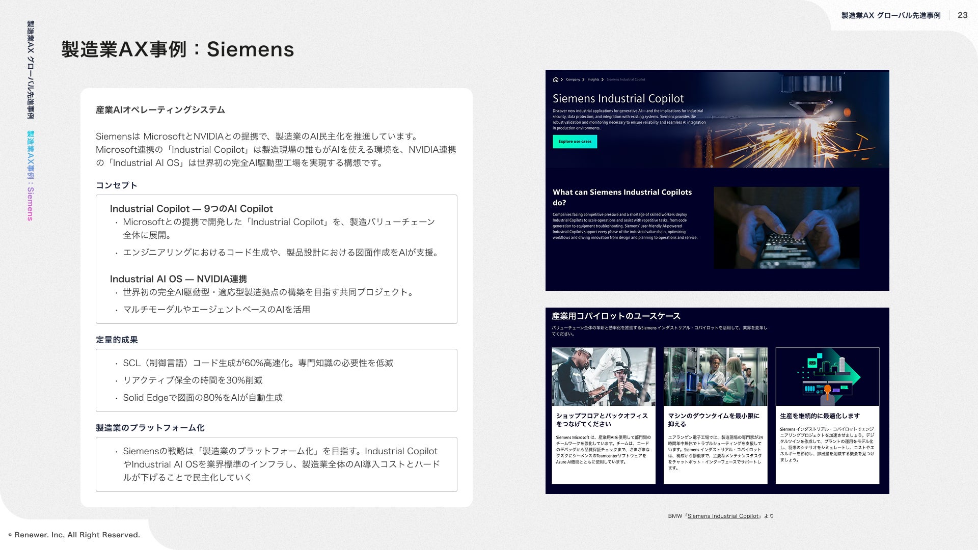 エンタープライズ企業における生成AI・AIエージェント活用支援を行う株式会社Renewer(本社:東京都渋谷区、代表取締役:堀内亮平、以下Renewer)は、AIのグローバル先進事例をまとめた『エンタープライズ × AI グローバル先進事例ガイド 2026』(全50ページ)を制作しました。