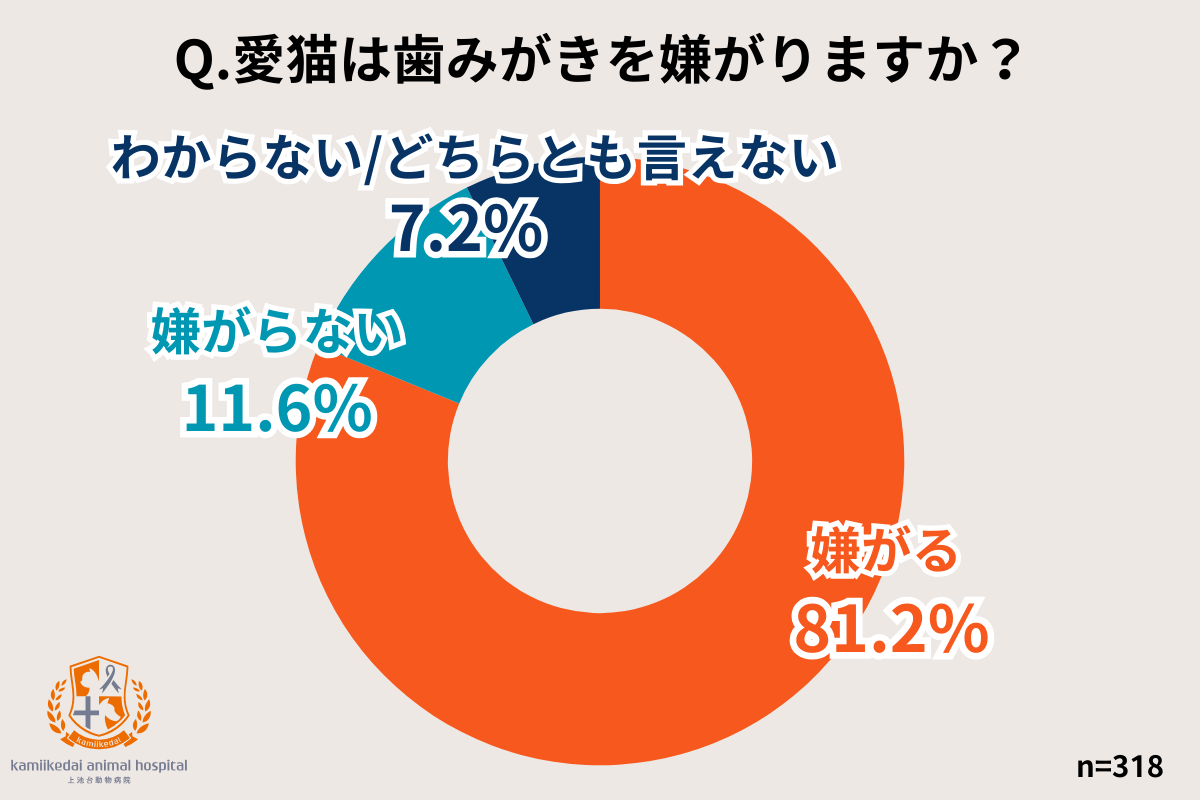 「愛猫は歯みがきを嫌がりますか?」という質問に対しては、「嫌がる(81.2%)」が8割を超えました。「嫌がらない(11.6%)」を大きく上回っており、多くの飼い主が"嫌がる"ことを課題として認識していることがうかがえます。