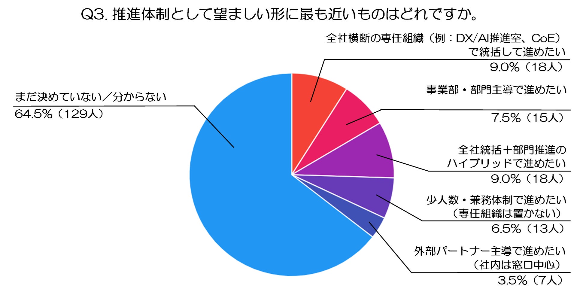 もっとも多かったのは「まだ決めていない/分からない」で、64.5%(129人)と全体の約3分の2を占めました。導入方針だけでなく、どのような体制で推進すべきかについても明確な答えを持てていない企業が多く、組織設計の段階で悩んでいる実態がうかがえます。