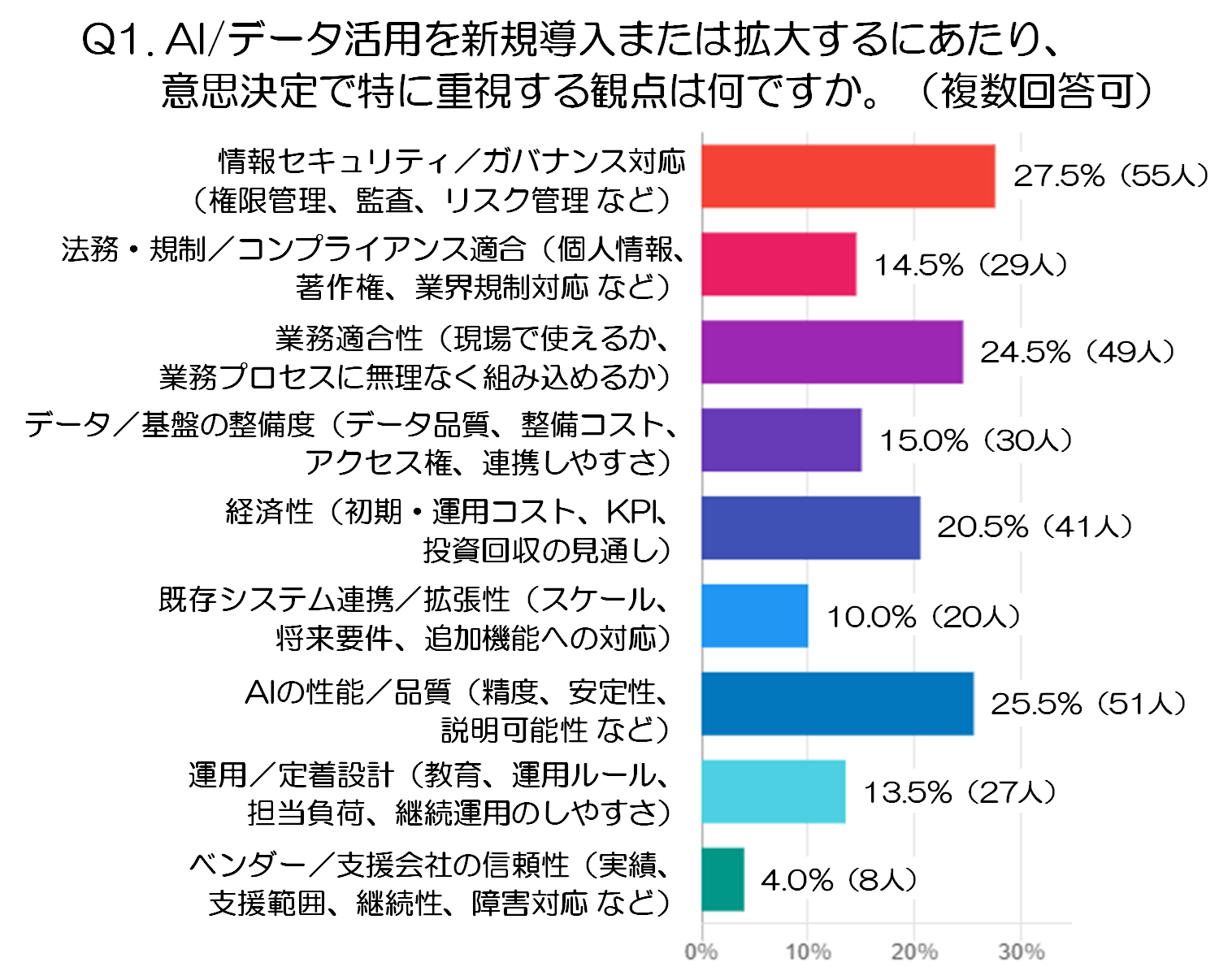Q1.AI/データ活用を新規導入または拡大するにあたり、意思決定で特に重視する観点は何ですか。(複数回答可:注1)