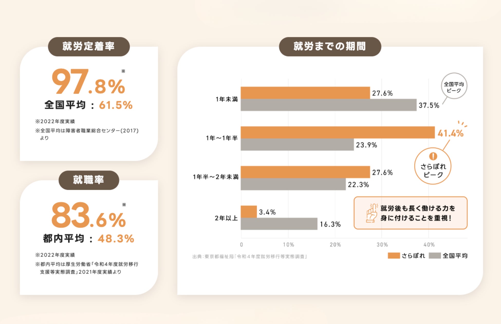 結果として就職後に6か月以上継続して勤務できているかを示す「就労定着率」は、毎年全国平均を大きく上回る水準を維持しています。