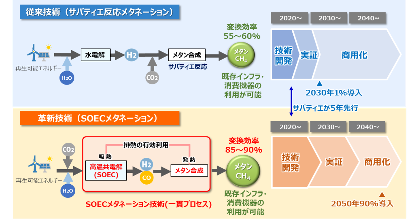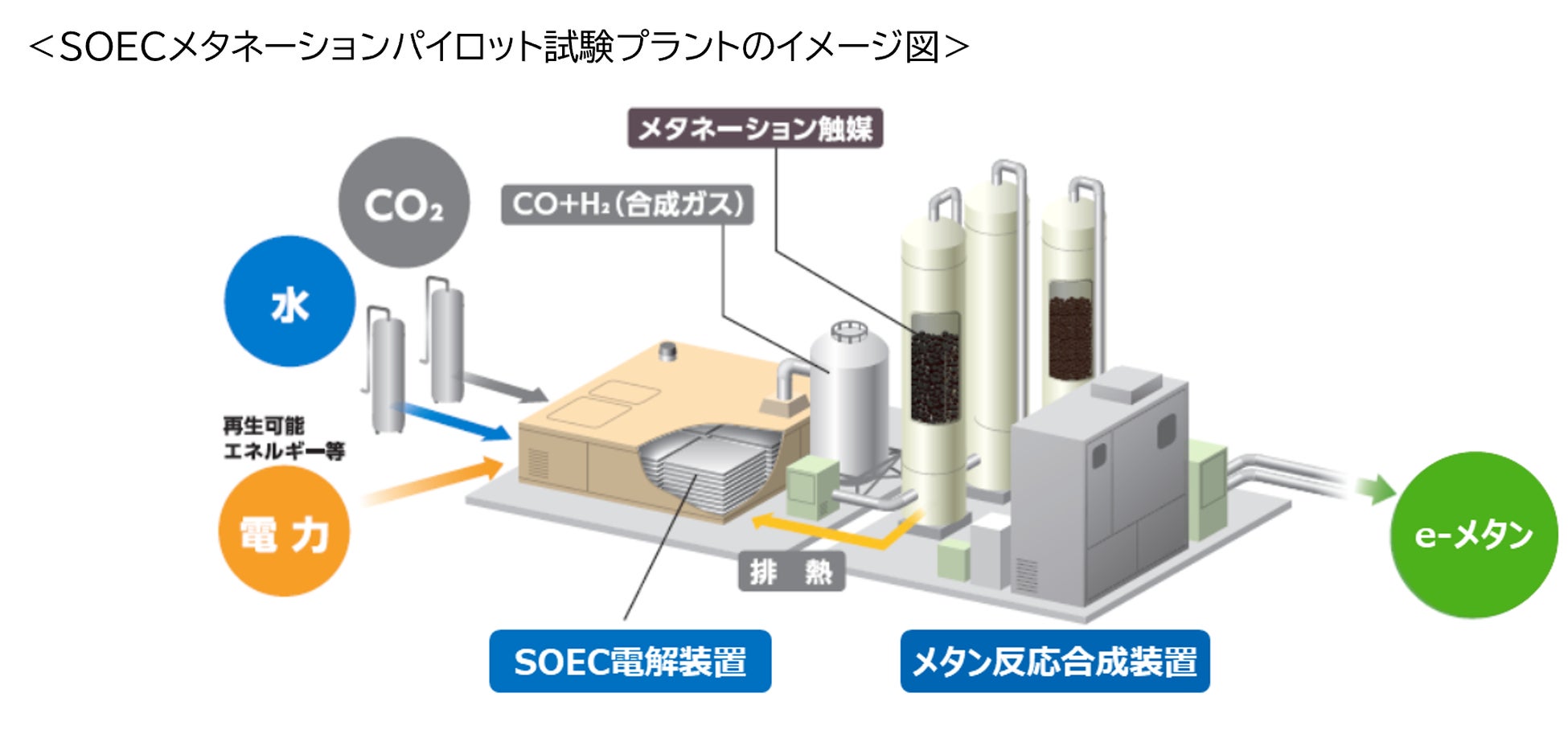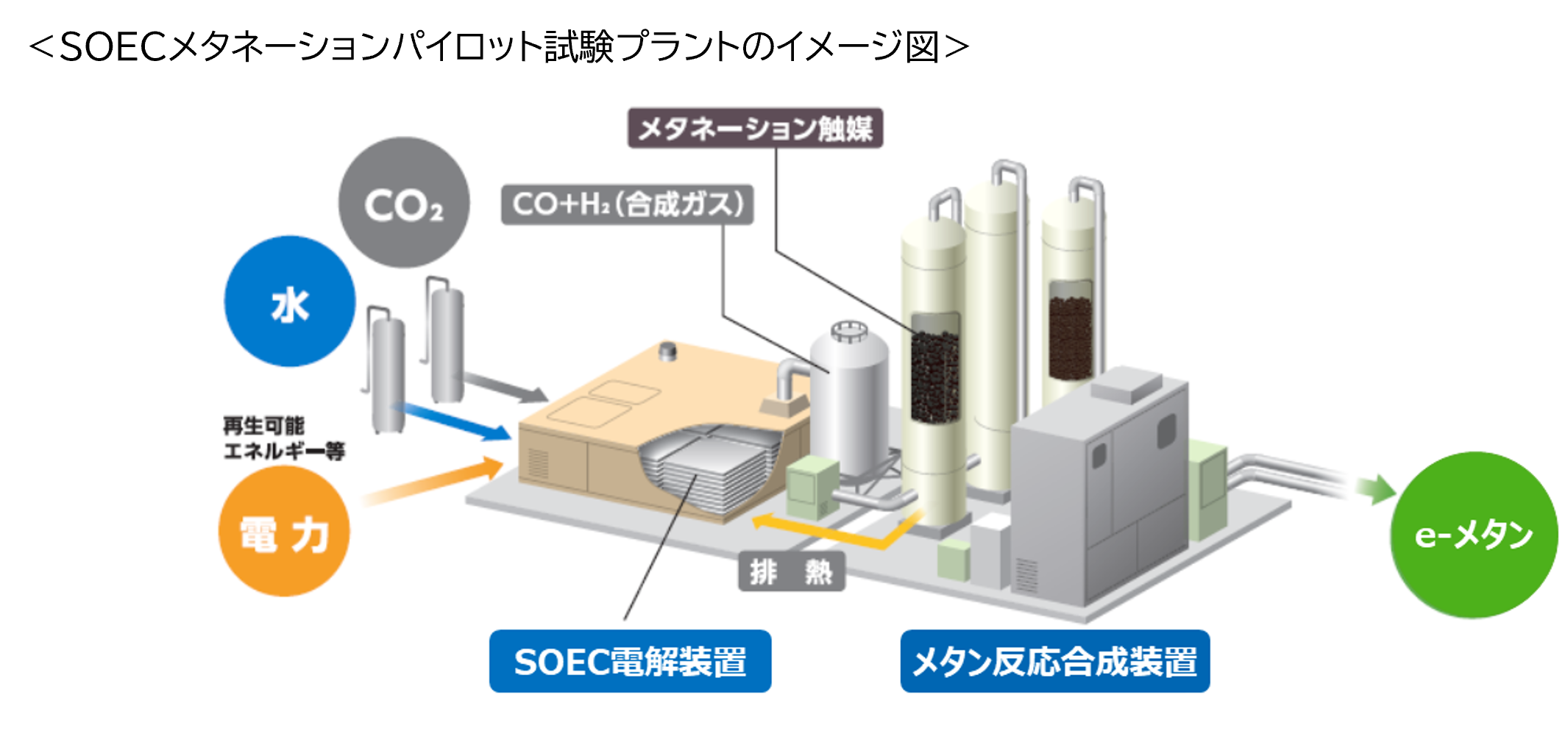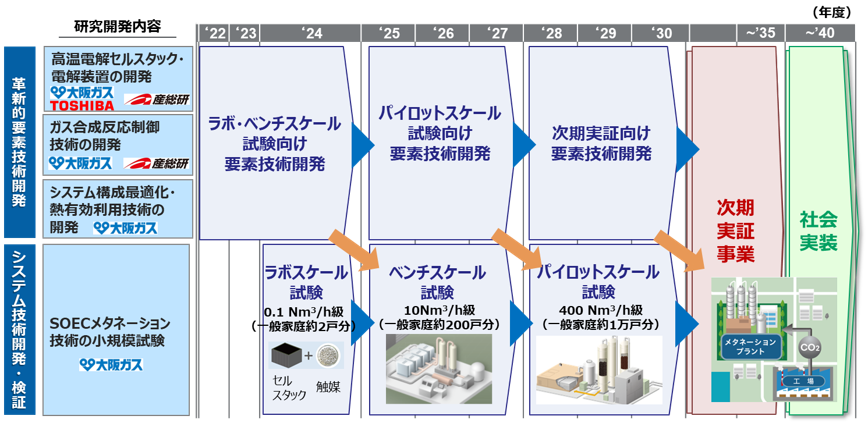 更にその後、グリーンイノベーション基金事業のもと、2025年度~2027年度にベンチスケール試験(e-メタン製造規模10Nm3/h級、一般家庭約200戸相当)、2028年度~2030年度にパイロットスケール試験(同400Nm3/h級、同約1万戸相当)を進め、2030年度に世界最高レベルのエネルギー変換効率(約85~90%)を実現するe-メタン製造技術の確立を目指します。