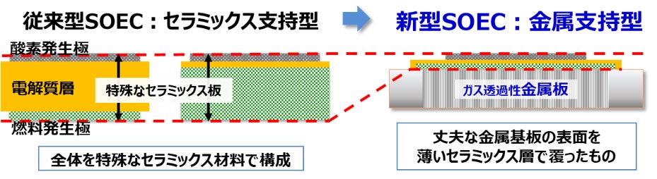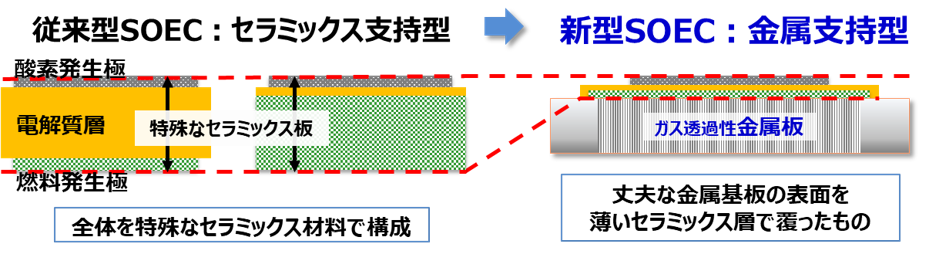 従来のSOECは、高価な特殊セラミックス(特殊な焼き物)で構成されていますが、大阪ガスの新型SOECは、琺瑯(ホーロー)食器のように、丈夫な金属を基板とし、表面を薄いセラミックス層で覆った金属支持型を使用しています。