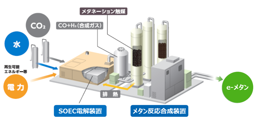 SOECメタネーションは、SOEC電解装置において再生可能エネルギー(以下「再エネ」)等を用いて水(H2O)と二酸化炭素(CO2)を電気分解し、生成した水素(H2)と(CO)一酸化炭素からメタン合成反応装置において触媒反応を用いてe-methane (以下「e-メタン」)を合成する革新技術です。