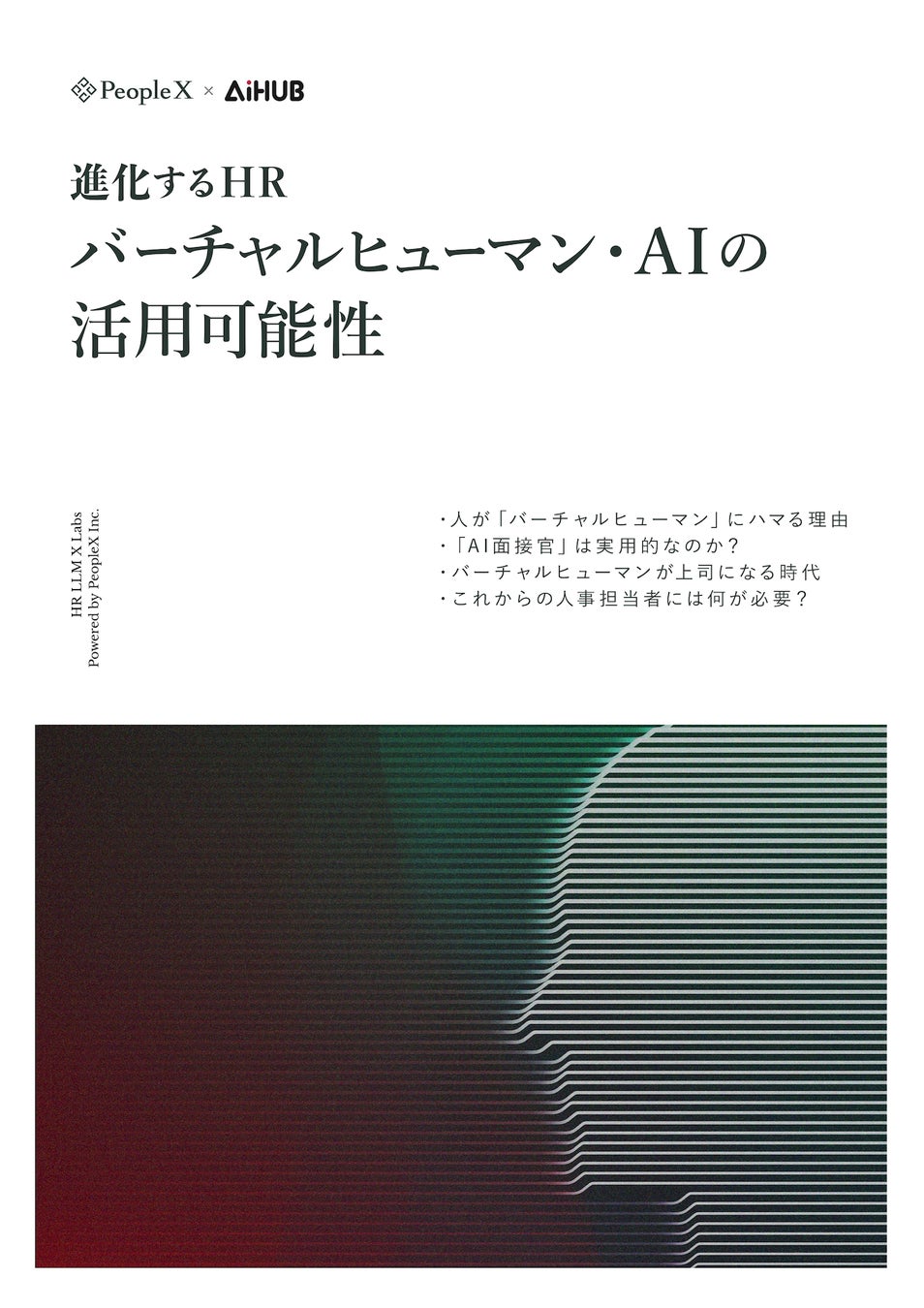 エンプロイーサクセス事業を推進する株式会社PeopleX(本社:東京都渋谷区、 代表取締役CEO:橘 大地、以下:当社)は、大規模言語モデル(以下:LLM)を含む生成AIに関連する技術を用いた、HR領域の新規事業開発に向けた研究を行う新組織「HR LLM X Labs(エイチアール エルエルエム エックスラボ)」※1の活動の一環として、HR領域におけるバーチャルヒューマン・AIの活用可能性についてAiHUB株式会社(本社:東京都千代田区、代表取締役 CEO:園田 れい、以下:AiHUB)と共同研究を行い、その成果をホワイトペーパーとして一般公開いたします。
