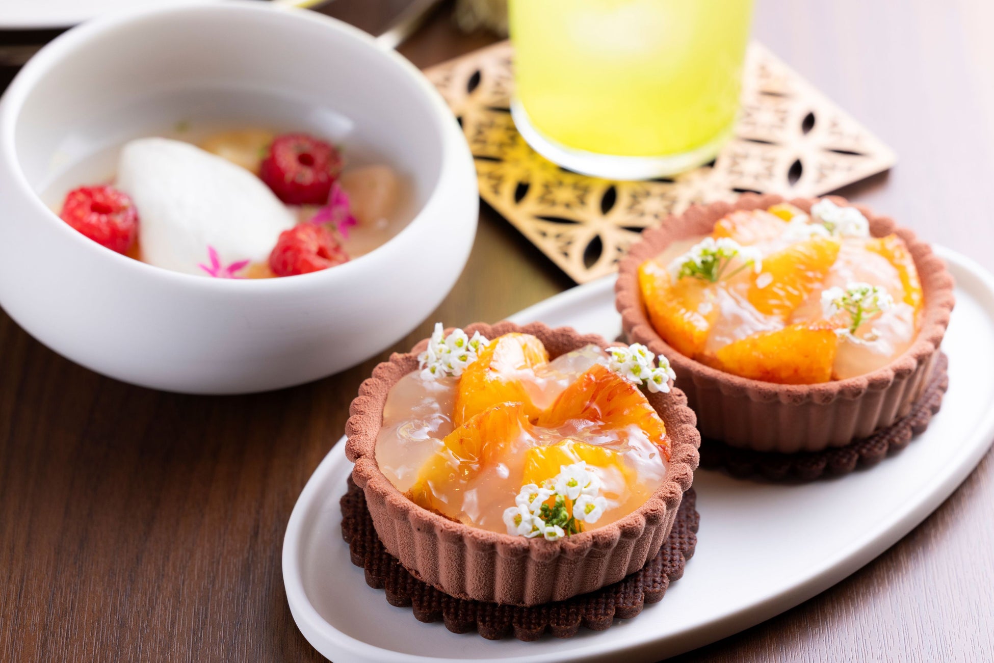 京都の暑い夏、ひんやりとした路地や鴨川を渡る爽やかな風。そんな“風”に吹かれるような涼しさを各レストランからお届けします。オールデイダイニング「テオリ」のビュッフェでは、ジューシーなローストビーフをはじめ、唐辛子の風味が食欲をそそる「ペリペリチキン」のほか鱧や茶そば、トッピングで楽しむ自家製豆腐ステーションをご用意。14時半からはアラカルトメニューとして「Shaved ice(かき氷)」が新登場。フレッシュマンゴー、ピーチ、メロンの全3種のほか、ココナッツやメロンを器にしたフォトジェニックな「サマースイーツ」3種とともにお楽しみいただけます。