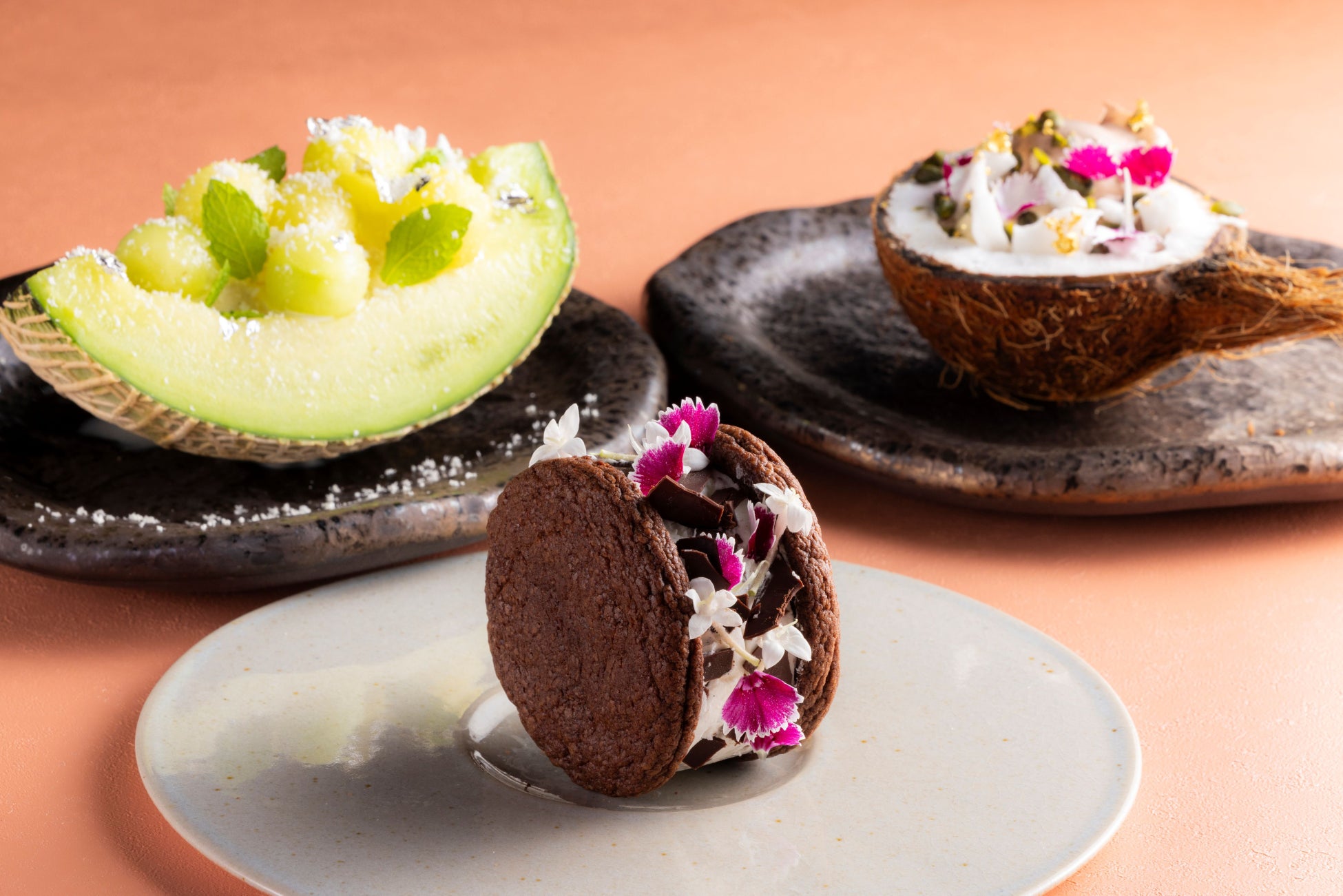 “Breeze in motion”をテーマにした、フォトジェニックで遊び心のあるスイーツたちをご用意しました。フレッシュなメロンやココナッツなど夏のフルーツをそのまま器に用いたオリジナルデザートと、ボリューミーなクッキーサンドアイスの全3種類。ティータイム限定で、オールデイダイニング「テオリ」でもご提供しております。お好みのドリンクとご一緒にどうぞ。