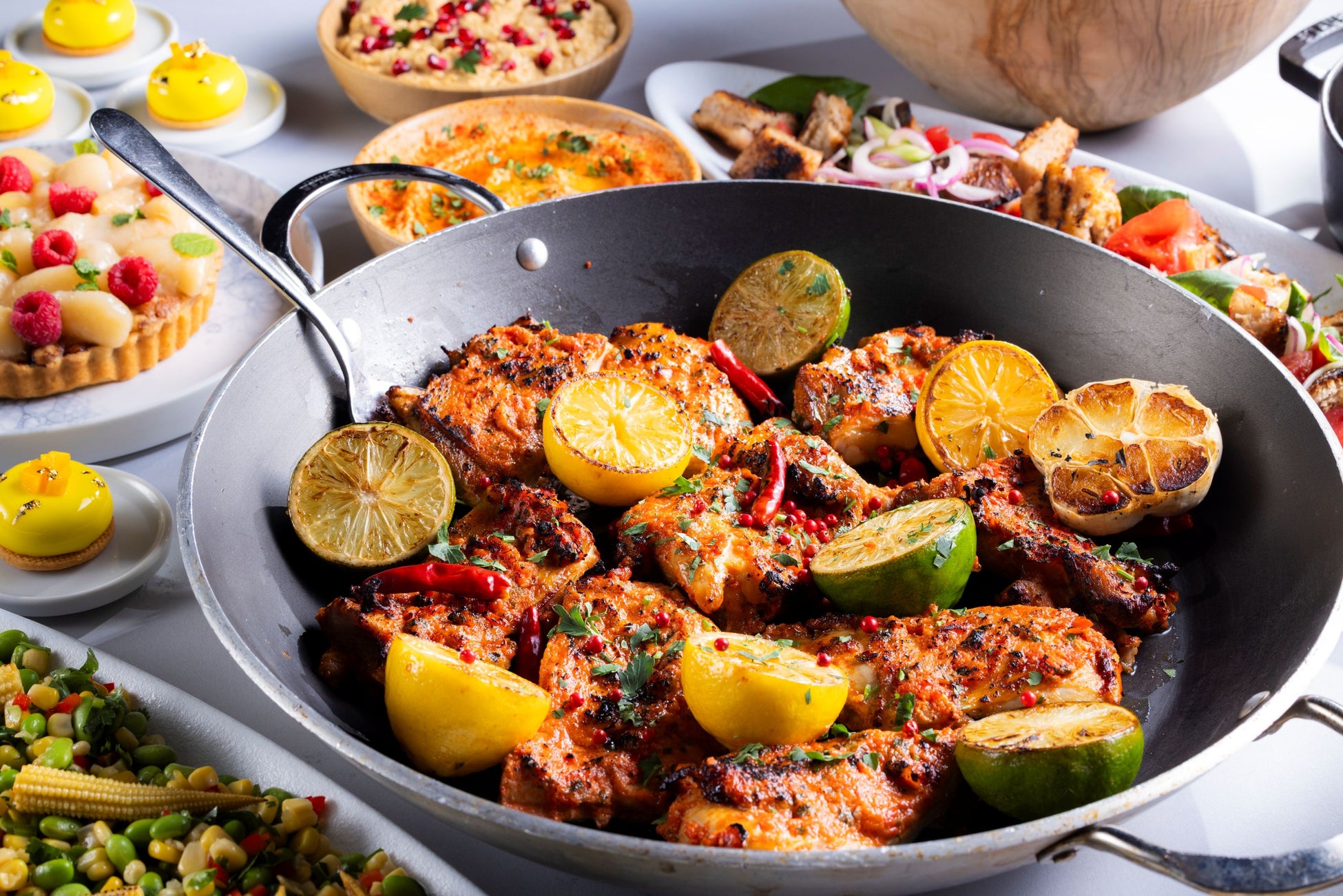 約50種、シェフの手作りにこだわった国際色豊かなお料理と本格的なスイーツをゆったりと。“Breeze in Harmony”をテーマにした爽やかなサマービュッフェです。冷たい茶そばや鱧、自家製胡麻湯葉豆腐など京の夏を感じるメニューをはじめ、夏野菜や柑橘、唐辛子でマリネしたペリペリチキンが登場。カービングステーションではジューシーなローストビーフ、その他夏のデザートまで勢揃い。ご家族、ご友人皆様でお楽しみください。