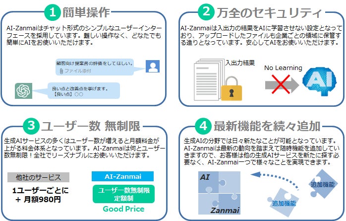 このような状況を踏まえ、企業・団体向けの生成AIサービス「AI-Zanmai」を新たに提供することといたしました。