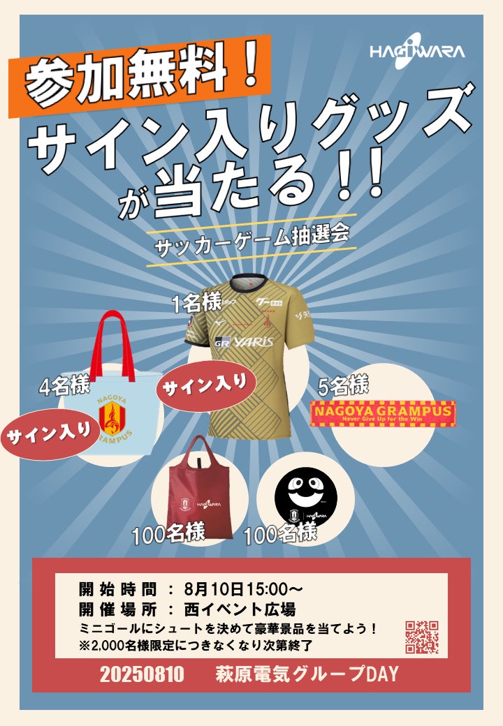 萩原電気グループは、2025年8月10日(日)に豊田スタジアム開催される「名古屋グランパス 対 京都サンガF.C.」戦にて、協賛試合『萩原電気グループDAY』を開催いたします。
