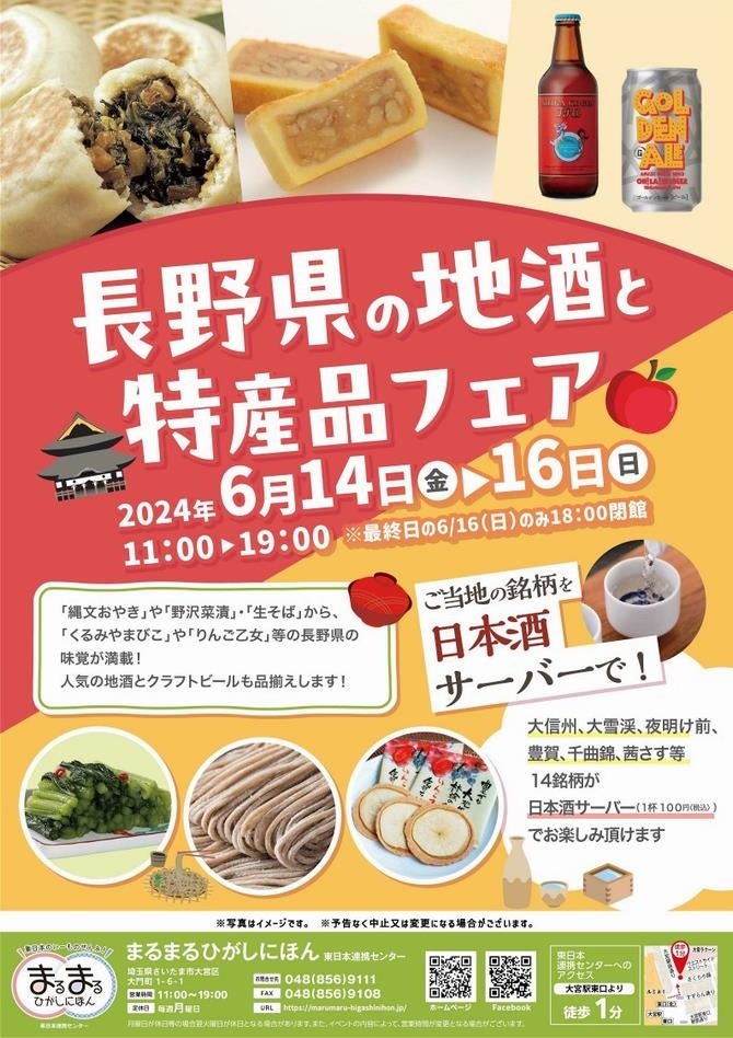 東⽇本の「ヒト・モノ・情報」が⼤宮に集合!⼤宮駅東⼝から徒歩1分のところにある、交流・発信・活性化を促す地⽅創⽣の場「まるまるひがしにほん(東⽇本連携センター)」で「長野県の地酒と特産品フェア」を開催します!6⽉14⽇(金)から6⽉16⽇(⽇)までの3⽇間限定イベントです。「縄文おやき」や「野沢菜漬」「生そば」から、「くるみやまびこ」や「りんご乙女」等の長野県の味覚が満載です!人気の地酒とクラフトビールも販売し、イベント中は長野県の地酒14銘柄を日本酒サーバー(1杯100円(税込))でお楽しみ頂けます。